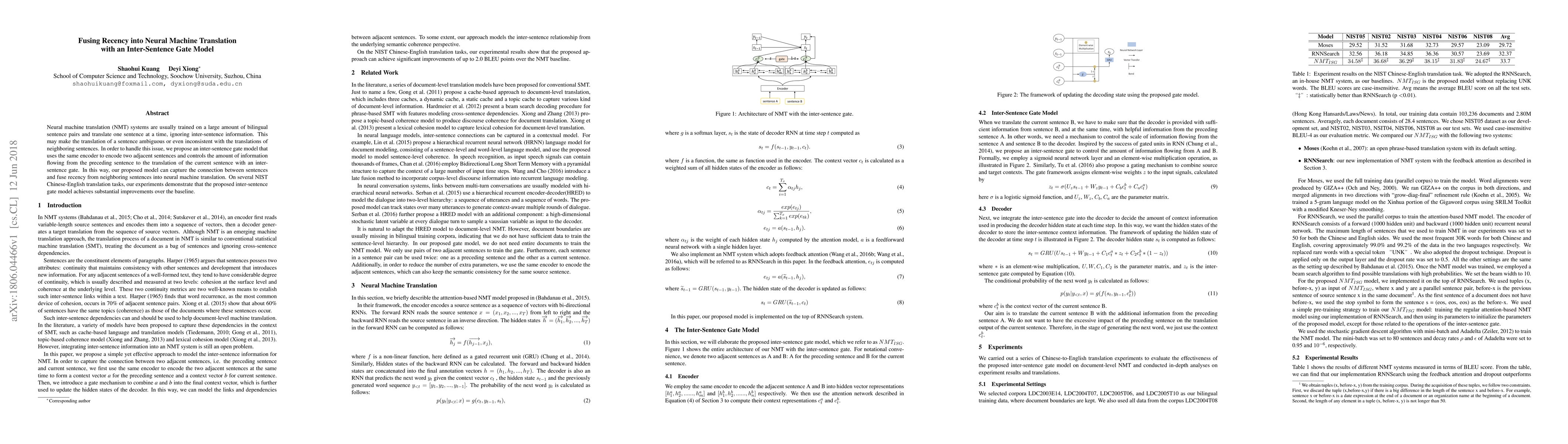 This paper proposes an inter-sentence gate model to enhance neural machine translation by incorporating information from adjacent sentences, thereby improving translation consistency. Experimental results on NIST Chinese-English translation tasks show significant improvements over baseline models.