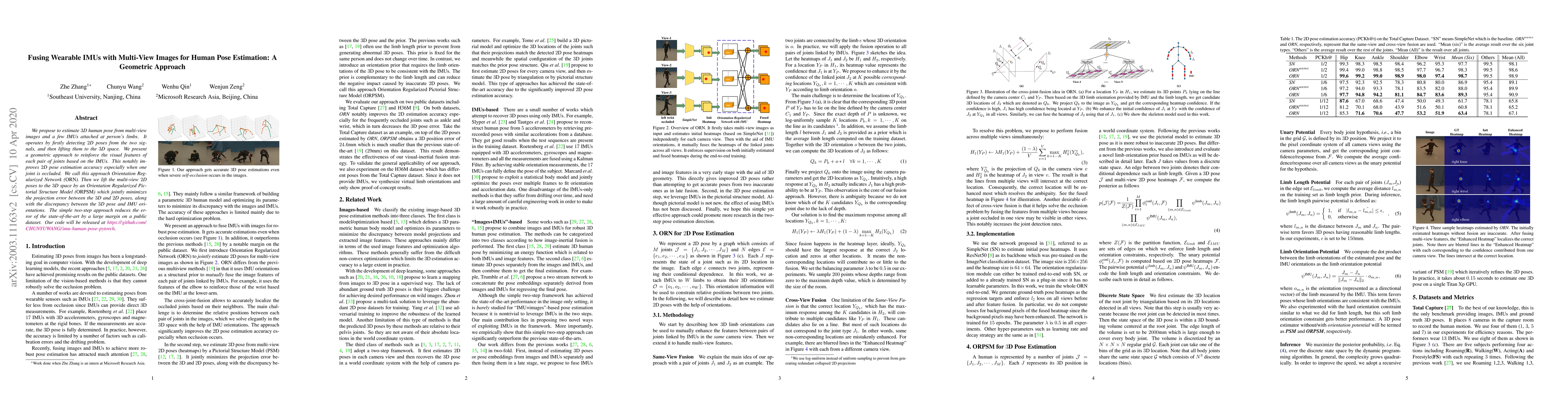 We propose to estimate 3D human pose from multi-view images and a few IMUs attached at person's limbs. It operates by firstly detecting 2D poses from the two signals, and then lifting them to the 3D space. We present a geometric approach to reinforce the visual features of each pair of joints based on the IMUs. This notably improves 2D pose estimation accuracy especially when one joint is occluded. We call this approach Orientation Regularized Network (ORN). Then we lift the multi-view 2D poses to the 3D space by an Orientation Regularized Pictorial Structure Model (ORPSM) which jointly minimizes the projection error between the 3D and 2D poses, along with the discrepancy between the 3D pose and IMU orientations. The simple two-step approach reduces the error of the state-of-the-art by a large margin on a public dataset. Our code will be released at https://github.com/CHUNYUWANG/imu-human-pose-pytorch.