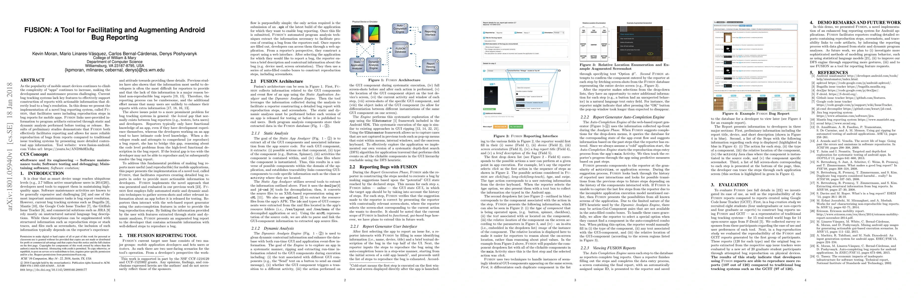 As the popularity of mobile smart devices continues to climb the complexity of "apps" continues to increase, making the development and maintenance process challenging. Current bug tracking systems lack key features to effectively support construction of reports with actionable information that directly lead to a bug's resolution. In this demo we present the implementation of a novel bug reporting system, called Fusion, that facilitates users including reproduction steps in bug reports for mobile apps. Fusion links user-provided information to program artifacts extracted through static and dynamic analysis performed before testing or release. Results of preliminary studies demonstrate that Fusion both effectively facilitates reporting and allows for more reliable reproduction of bugs from reports compared to traditional issue tracking systems by presenting more detailed contextual app information. Tool website: www.fusion-android. com Video url: https://youtu.be/AND9h0ElxRg