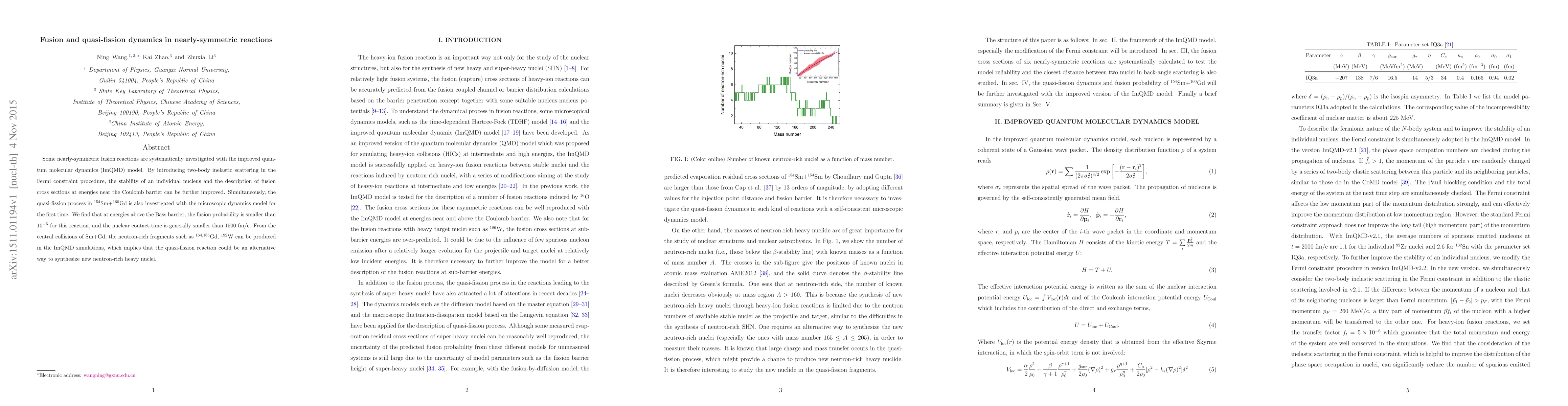 Some nearly-symmetric fusion reactions are systematically investigated with the improved quantum molecular dynamics (ImQMD) model. By introducing two-body inelastic scattering in the Fermi constraint procedure, the stability of an individual nucleus and the description of fusion cross sections at energies near the Coulomb barrier can be further improved. Simultaneously, the quasi-fission process in $^{154}$Sm+$^{160}$Gd is also investigated with the microscopic dynamics model for the first time. We find that at energies above the Bass barrier, the fusion probability is smaller than $10^{-5}$ for this reaction, and the nuclear contact-time is generally smaller than $1500$ fm/c. From the central collisions of Sm+Gd, the neutron-rich fragments such as $^{164,165}$Gd, $^{192}$W can be produced in the ImQMD simulations, which implies that the quasi-fission reaction could be an alternative way to synthesize new neutron-rich heavy nuclei.