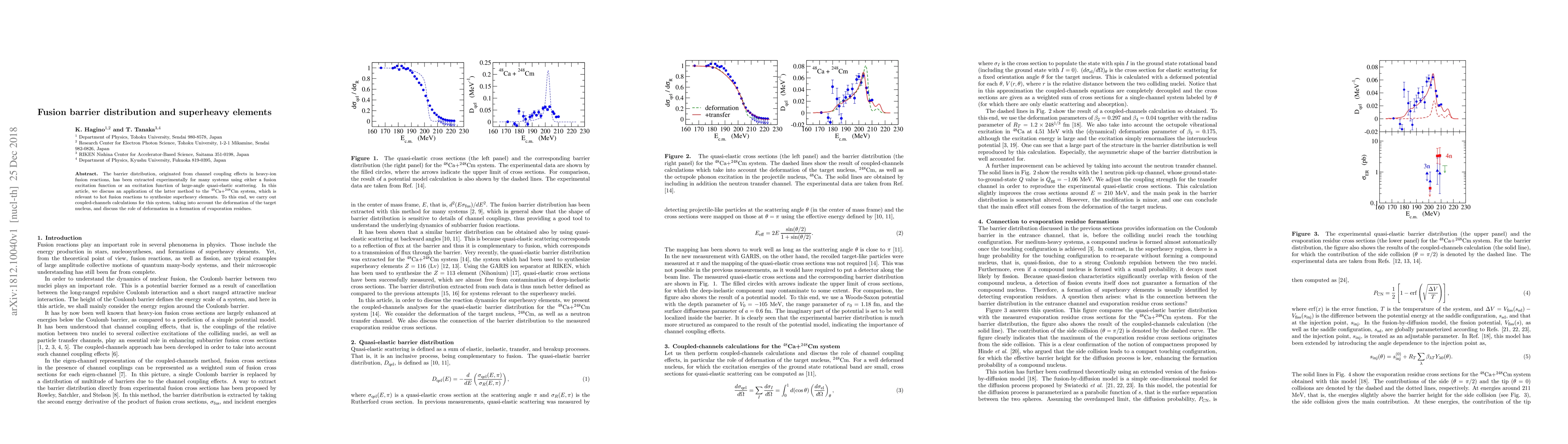 The barrier distribution, originated from channel coupling effects in heavy-ion fusion reactions, has been extracted experimentally for many systems using either a fusion excitation function or an excitation function of large-angle quasi-elastic scattering. In this article, we discuss an application of the latter method to the $^{48}$Ca+$^{248}$Cm system, which is relevant to hot fusion reactions to synthesize superheavy elements. To this end, we carry out coupled-channels calculations for this system, taking into account the deformation of the target nucleus, and discuss the role of deformation in a formation of evaporation residues.