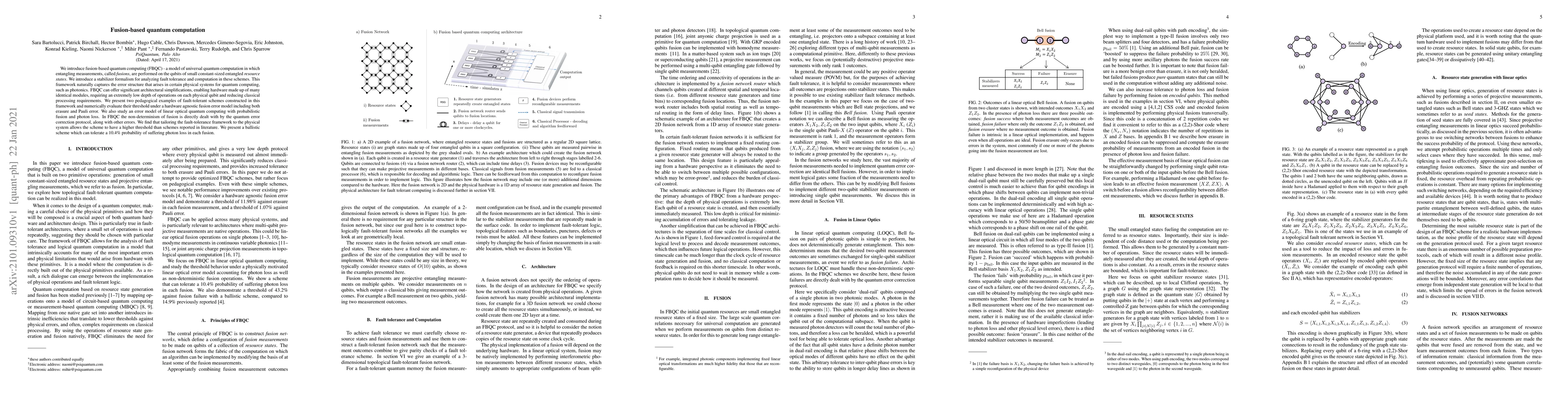 Fusion-based quantum computation (FBQC) introduces a universal quantum computing model using entangling measurements called fusions on small entangled qubits. This framework simplifies architecture and enhances fault tolerance, achieving higher thresholds than existing schemes, with a ballistic scheme tolerating up to 10.4% photon loss.
