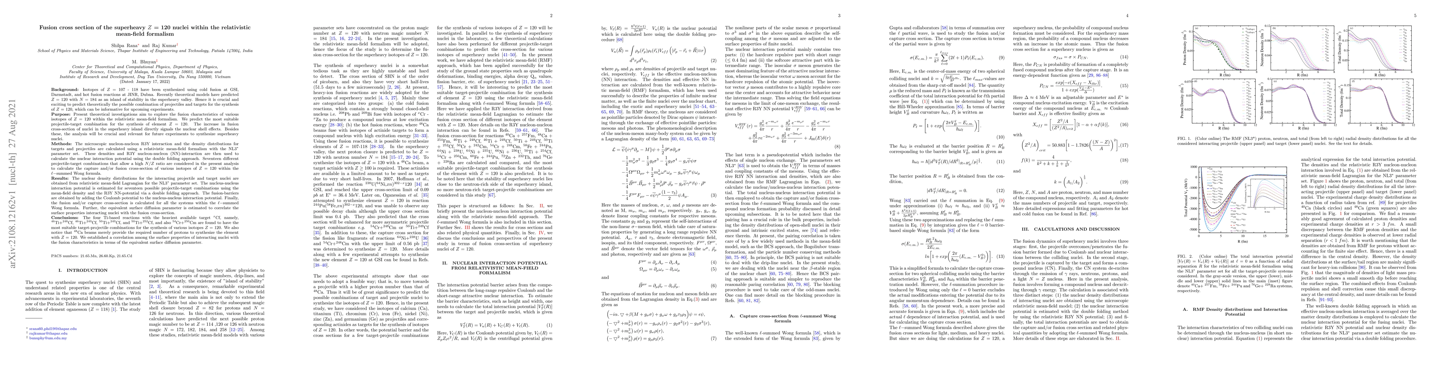 Researchers explore fusion reactions of superheavy Z=120 nuclei using relativistic mean-field formalism to predict suitable projectile-target combinations for element synthesis.