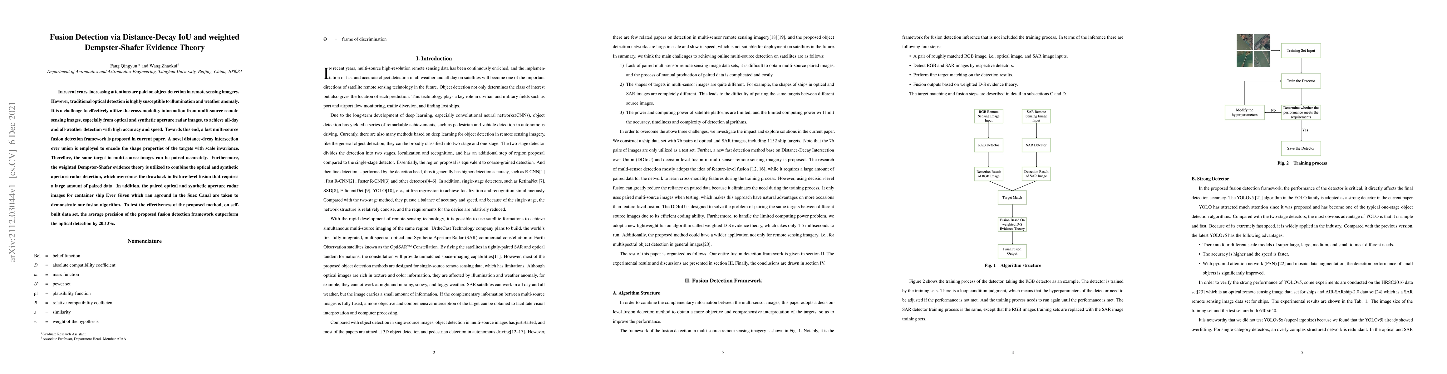 This paper proposes a fusion detection framework combining optical and synthetic aperture radar images for all-day, all-weather detection. It employs a novel distance-decay IoU for target pairing and uses weighted Dempster-Shafer evidence theory for feature-level fusion, achieving a 20.13% improvement in average precision over optical detection.