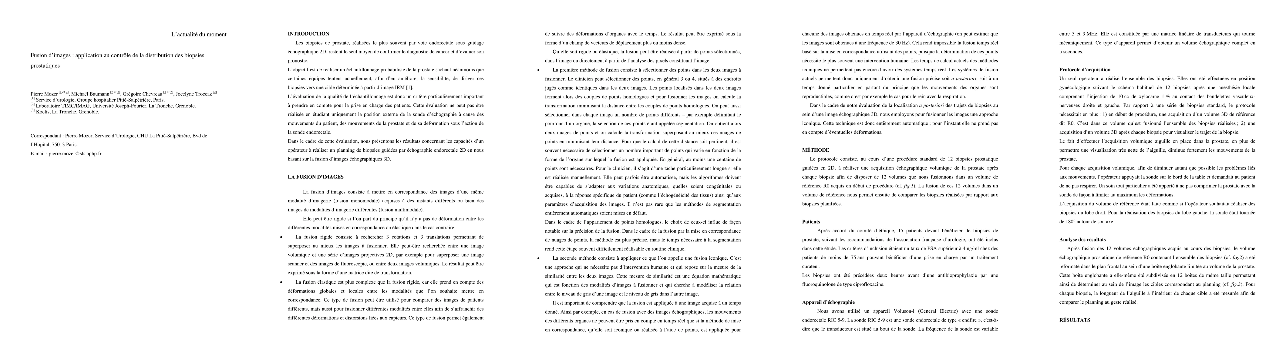 This paper is about the application of a 3D ultrasound data fusion technique to the 3D reconstruction of prostate biopies in a reference volume. The method is introduced and its evaluation on a series of data coming from 15 patients is described.