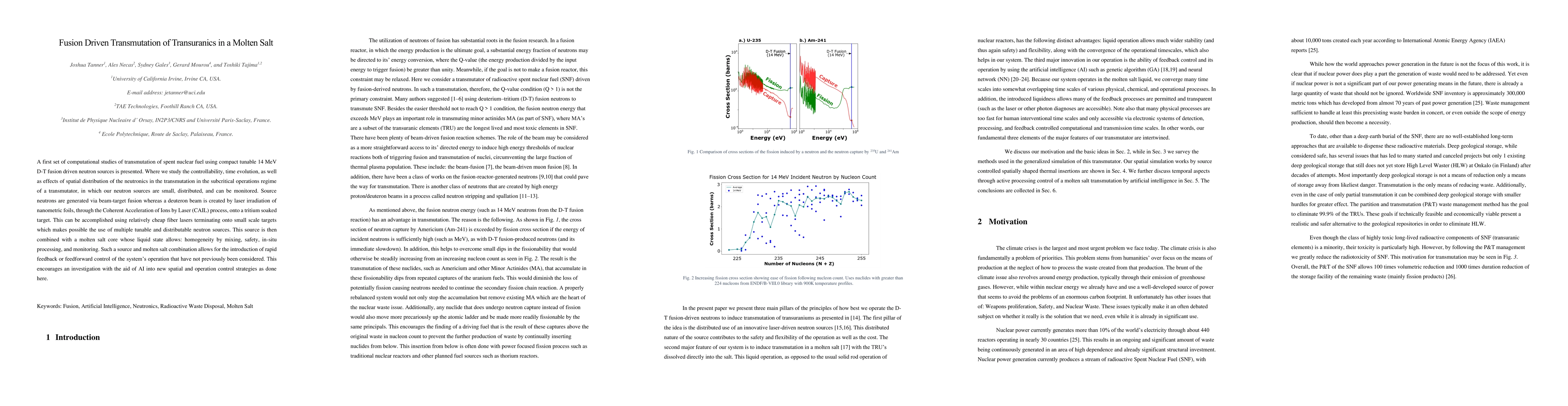 A first set of computational studies of transmutation of spent nuclear fuel using compact tunable 14 MeV D-T fusion driven neutron sources is presenter. Where we study the controllability, time evolution, as well as effects of spatial distribution of the neutronics in the transmutation in the subcritical operations regime of a transmutator, in which our neutron sources are small, distributed, and can be monitored. Source neutrons are generated via beam-target fusion whereas a deuteron beam is created by laser irradiation of nanometric foils, through the Coherent Acceleration of Ions by Laser (CAIL) process, onto a tritium soaked target. This can be accomplished using relatively cheap fiber lasers terminating onto small scale targets which makes possible the use of multiple tunable and distributable neutron sources. This source is then combined with a molten salt core whose liquid state allows: homogeneity by mixing, safety, in-situ processing, and monitoring. Such a source and molten salt combination allows for the introduction of rapid feedback or feedforward control of the system's operation that have not previously been considered. This encourages an investigation with the aid of AI into new spatial and operation control strategies as done here.