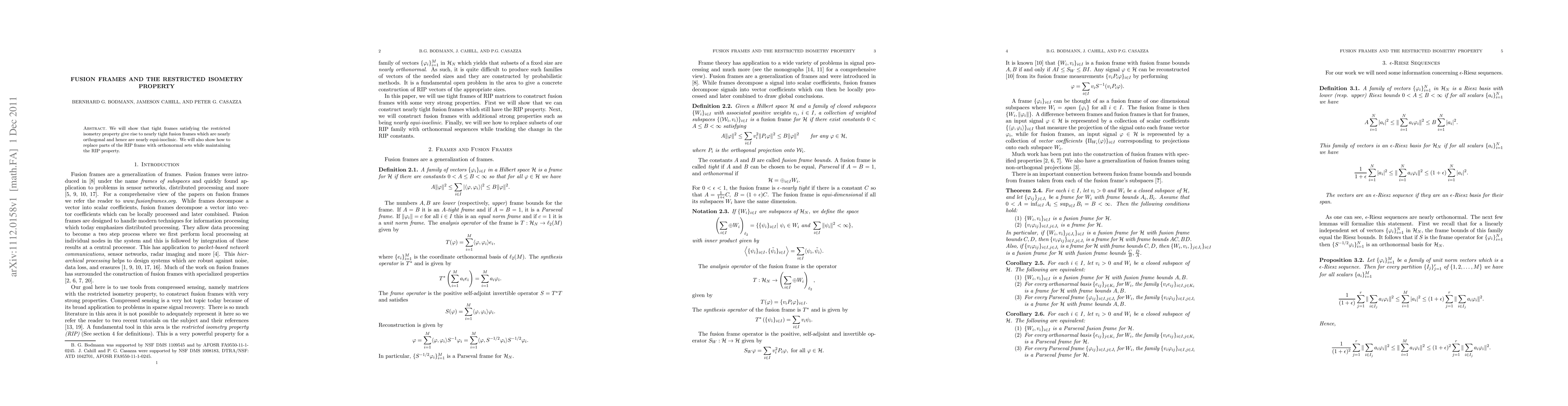 Summary: This paper demonstrates that tight frames with the restricted isometry property (RIP) can be transformed into nearly tight, nearly orthogonal fusion frames, and explores how parts of the RIP frame can be substituted with orthonormal sets without losing the RIP property.
