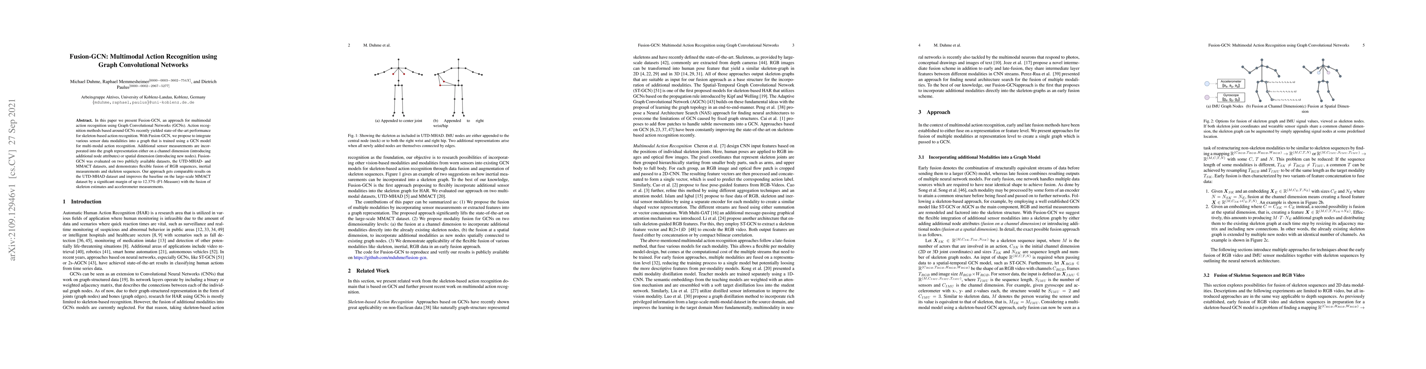 Fusion-GCN integrates various sensor data modalities into a graph for multi-modal action recognition using Graph Convolutional Networks, achieving state-of-the-art results on UTD-MHAD and significant improvements on MMACT datasets.