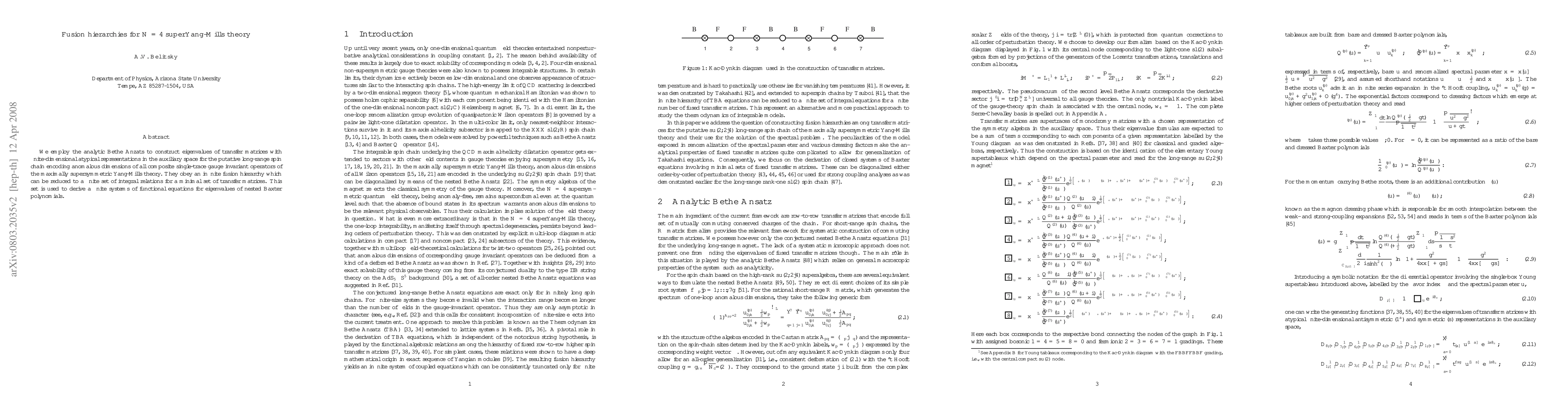 We employ the analytic Bethe Anzats to construct eigenvalues of transfer matrices with finite-dimensional atypical representations in the auxiliary space for the putative long-range spin chain encoding anomalous dimensions of all composite single-trace gauge invariant operators of the maximally supersymmetric Yang-Mills theory. They obey an infinite fusion hierarchy which can be reduced to a finite set of integral relations for a minimal set of transfer matrices. This set is used to derive a finite systems of functional equations for eigenvalues of nested Baxter polynomials.