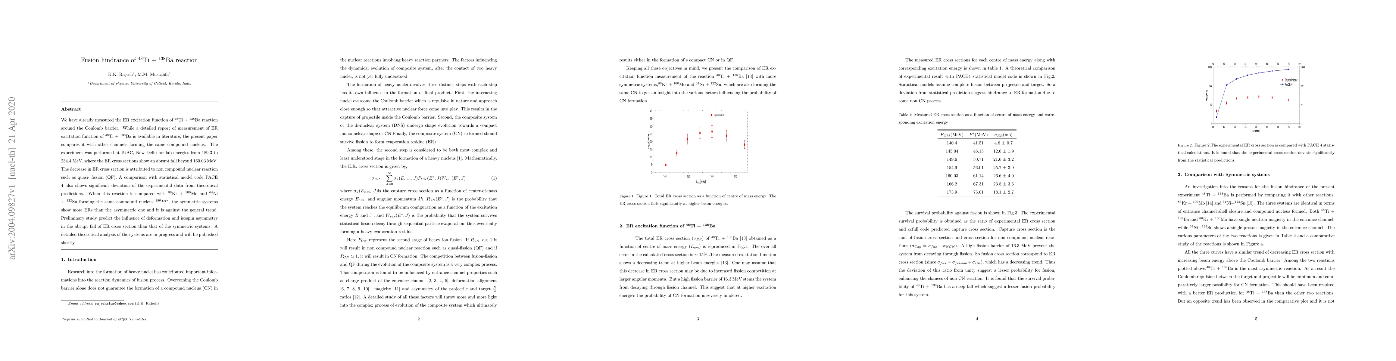 This paper investigates the fusion hindrance in the $^{48}$Ti + $^{138}$Ba reaction, noting an abrupt fall in ER cross sections beyond 160.03 MeV, attributed to quasi-fission. Comparisons with other reactions forming the same compound nucleus reveal unexpected behavior, suggesting deformation and isospin asymmetry play a role in fusion hindrance.