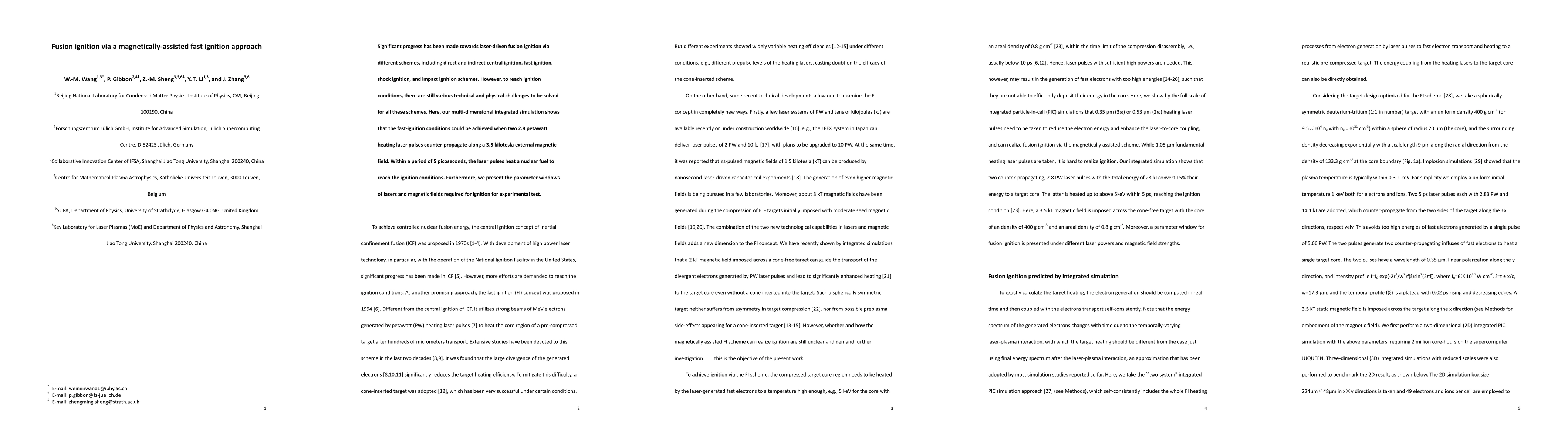 This research demonstrates a magnetically-assisted fast ignition approach for laser-driven fusion ignition, showing that counter-propagating 2.8 petawatt laser pulses within a 3.5 kilotesla magnetic field can heat nuclear fuel to ignition conditions in 5 picoseconds. The study also outlines the necessary parameters for experimental validation.
