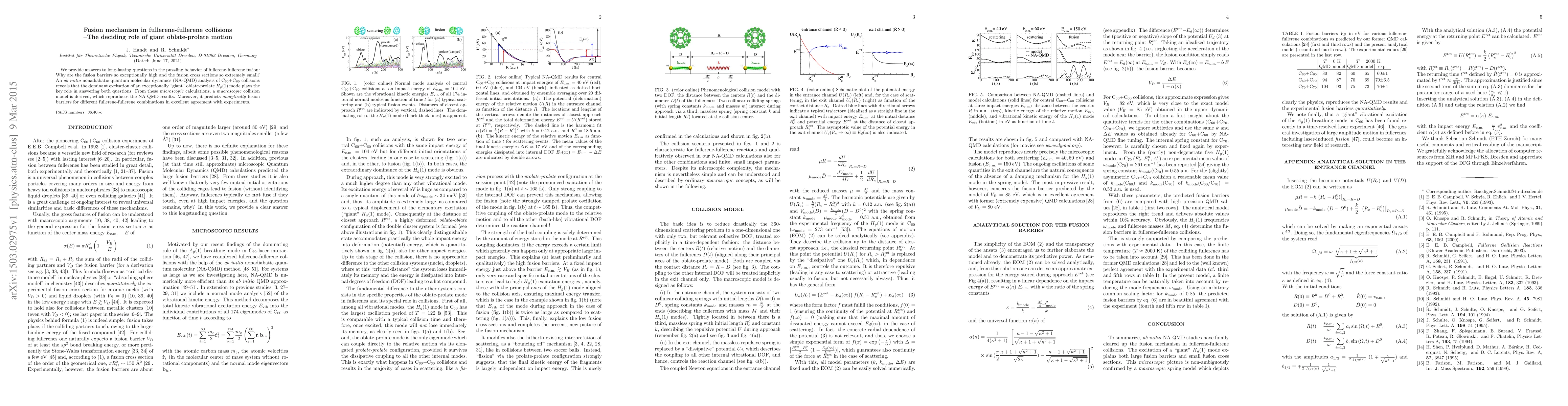 This paper investigates the fusion mechanism in fullerene-fullerene collisions, revealing that the exceptionally high fusion barriers and small fusion cross sections are due to the dominant excitation of a "giant" oblate-prolate H$_g(1)$ mode. The study uses ab initio nonadiabatic quantum molecular dynamics to derive a macroscopic collision model that accurately predicts fusion barriers for various fullerene combinations.