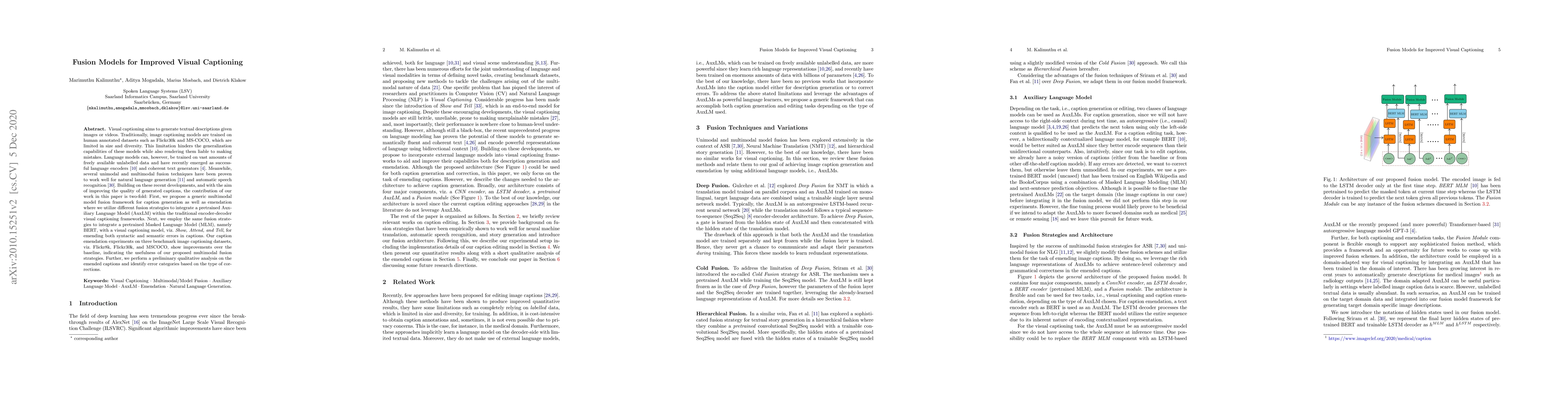 Visual captioning aims to generate textual descriptions given images or videos. Traditionally, image captioning models are trained on human annotated datasets such as Flickr30k and MS-COCO, which are limited in size and diversity. This limitation hinders the generalization capabilities of these models while also rendering them liable to making mistakes. Language models can, however, be trained on vast amounts of freely available unlabelled data and have recently emerged as successful language encoders and coherent text generators. Meanwhile, several unimodal and multimodal fusion techniques have been proven to work well for natural language generation and automatic speech recognition. Building on these recent developments, and with the aim of improving the quality of generated captions, the contribution of our work in this paper is two-fold: First, we propose a generic multimodal model fusion framework for caption generation as well as emendation where we utilize different fusion strategies to integrate a pretrained Auxiliary Language Model (AuxLM) within the traditional encoder-decoder visual captioning frameworks. Next, we employ the same fusion strategies to integrate a pretrained Masked Language Model (MLM), namely BERT, with a visual captioning model, viz. Show, Attend, and Tell, for emending both syntactic and semantic errors in captions. Our caption emendation experiments on three benchmark image captioning datasets, viz. Flickr8k, Flickr30k, and MSCOCO, show improvements over the baseline, indicating the usefulness of our proposed multimodal fusion strategies. Further, we perform a preliminary qualitative analysis on the emended captions and identify error categories based on the type of corrections.