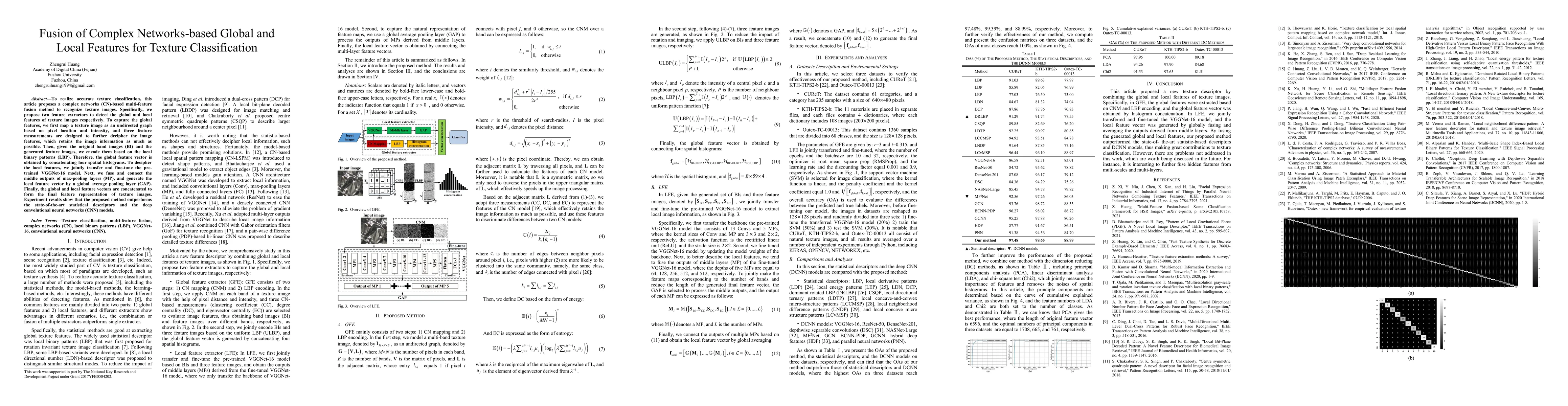 To realize accurate texture classification, this article proposes a complex networks (CN)-based multi-feature fusion method to recognize texture images. Specifically, we propose two feature extractors to detect the global and local features of texture images respectively. To capture the global features, we first map a texture image as an undirected graph based on pixel location and intensity, and three feature measurements are designed to further decipher the image features, which retains the image information as much as possible. Then, given the original band images (BI) and the generated feature images, we encode them based on the local binary patterns (LBP). Therefore, the global feature vector is obtained by concatenating four spatial histograms. To decipher the local features, we jointly transfer and fine-tune the pre-trained VGGNet-16 model. Next, we fuse and connect the middle outputs of max-pooling layers (MP), and generate the local feature vector by a global average pooling layer (GAP). Finally, the global and local feature vectors are concatenated to form the final feature representation of texture images. Experiment results show that the proposed method outperforms the state-of-the-art statistical descriptors and the deep convolutional neural networks (CNN) models.