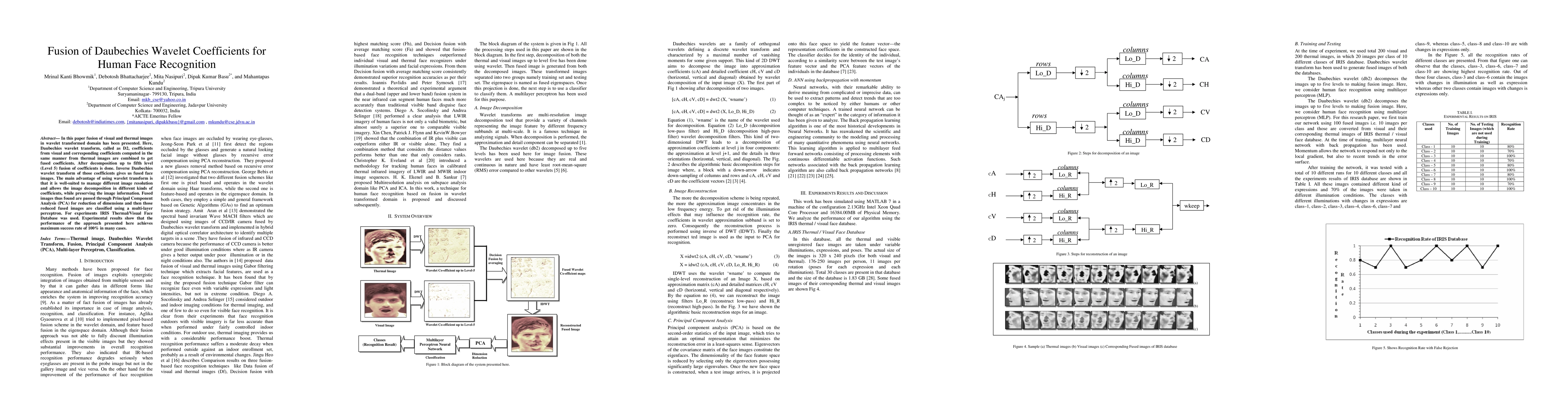 In this paper fusion of visual and thermal images in wavelet transformed domain has been presented. Here, Daubechies wavelet transform, called as D2, coefficients from visual and corresponding coefficients computed in the same manner from thermal images are combined to get fused coefficients. After decomposition up to fifth level (Level 5) fusion of coefficients is done. Inverse Daubechies wavelet transform of those coefficients gives us fused face images. The main advantage of using wavelet transform is that it is well-suited to manage different image resolution and allows the image decomposition in different kinds of coefficients, while preserving the image information. Fused images thus found are passed through Principal Component Analysis (PCA) for reduction of dimensions and then those reduced fused images are classified using a multi-layer perceptron. For experiments IRIS Thermal/Visual Face Database was used. Experimental results show that the performance of the approach presented here achieves maximum success rate of 100% in many cases.