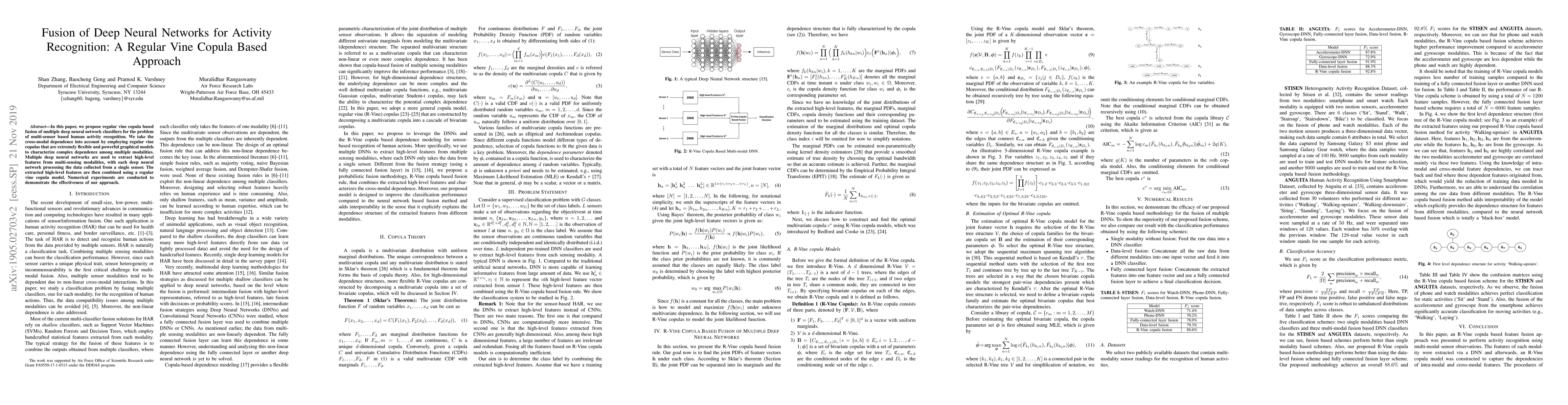 This paper proposes a method using regular vine copulas to fuse multiple deep neural networks for multi-sensor human activity recognition, accounting for cross-modal dependencies. The approach combines high-level features extracted from different sensors through a flexible vine copula model, demonstrating improved recognition performance.