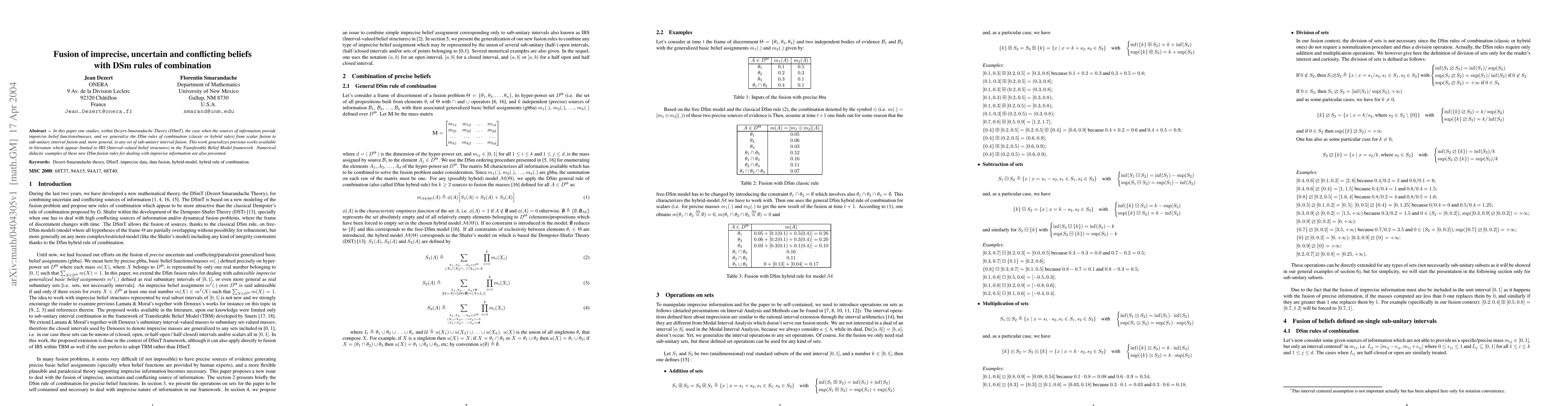 This paper extends Dezert-Smarandache Theory to handle imprecise information with new fusion rules for combining beliefs, allowing for sub-unitary interval fusion and beyond. It provides a general framework for dealing with conflicting and uncertain information in belief structures.