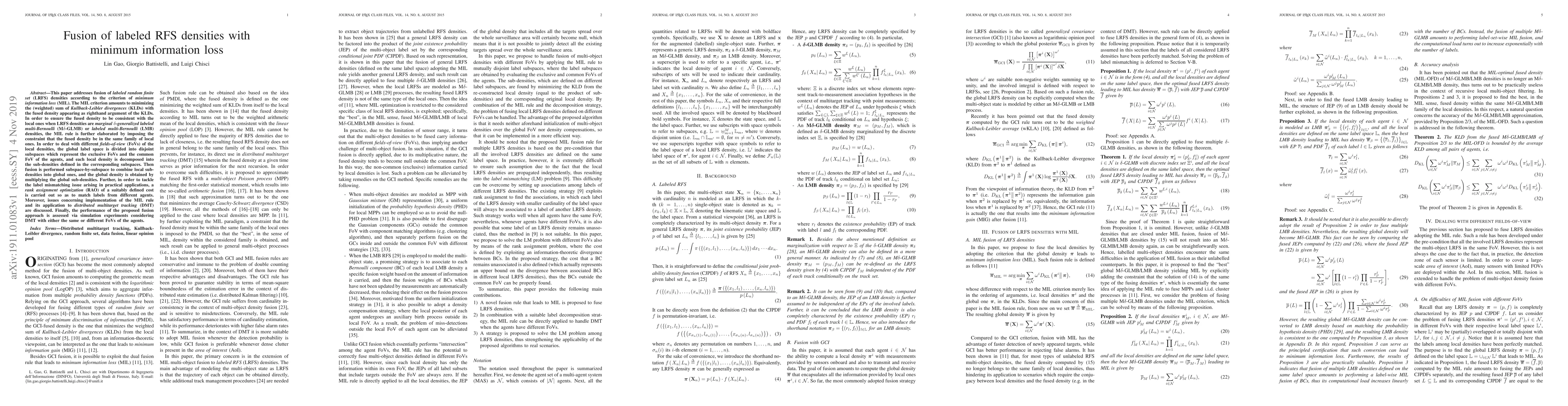 This paper addresses fusion of labeled random finite set (LRFS) densities according to the criterion of minimum information loss (MIL). The MIL criterion amounts to minimizing the (weighted) sum of Kullback-Leibler divergences (KLDs) with the fused density appearing as righthand argument of the KLDs. In order to ensure the fused density to be consistent with the local ones when LRFS densities are marginal $\delta$-generalized labeled multi-Bernoulli (M$\delta$-GLMB) or labeled multi-Bernoulli (LMB) densities, the MIL rule is further elaborated by imposing the constraint that the fused density be in the same family of local ones. In order to deal with different fields-of-view (FoVs) of the local densities, the global label space is divided into disjoint subspaces which represent the exclusive FoVs and the common FoV of the agents, and each local density is decomposed into the sub-densities defined in the corresponding subspaces. Then fusion is performed subspace-by-subspace to combine local subdensities into global ones, and the global density is obtained by multiplying the global sub-densities. Further, in order to tackle the label mismatching issue arising in practical applications, a rank assignment optimization (RAO) of a suitably defined cost is carried out so as to match labels from different agents. Moreover, issues concerning implementation of the MIL rule and its application to distributed multitarget tracking (DMT) are discussed. Finally, the performance of the proposed fusion approach is assessed via simulation experiments considering DMT with either the same or different FoVs of the agents.