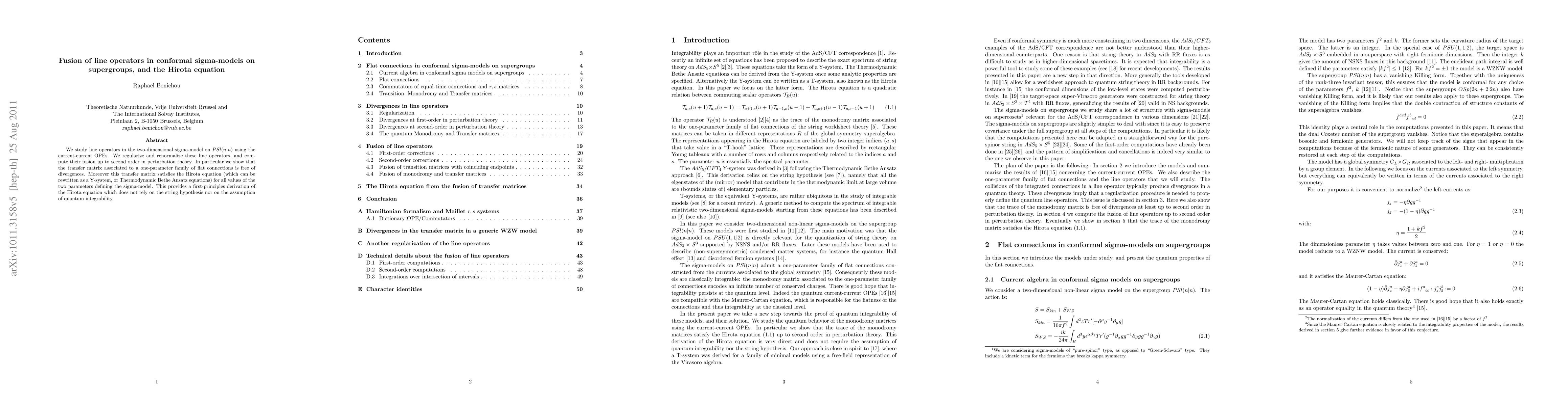 This paper investigates line operators in two-dimensional sigma-models on supergroups, specifically PSl(n|n), and demonstrates their fusion using current-current OPEs. It reveals that the transfer matrix for a family of flat connections is divergence-free and satisfies the Hirota equation for all model parameters, providing a novel derivation of the Hirota equation independent of string theory or quantum integrability assumptions.