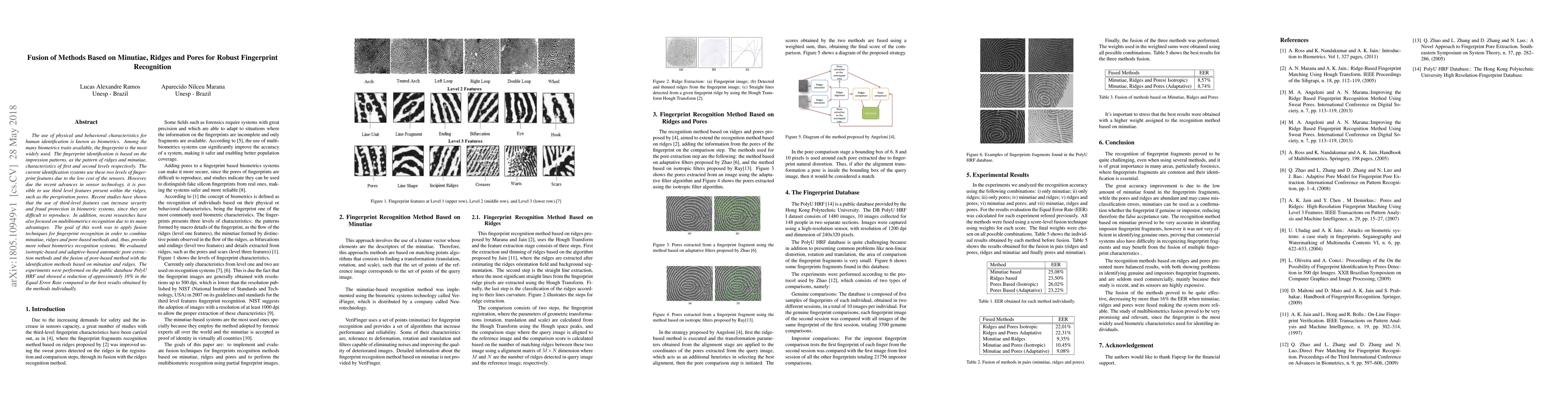 The use of physical and behavioral characteristics for human identification is known as biometrics. Among the many biometrics traits available, the fingerprint is the most widely used. The fingerprint identification is based on the impression patterns, as the pattern of ridges and minutiae, characteristics of first and second levels respectively. The current identification systems use these two levels of fingerprint features due to the low cost of the sensors. However, due the recent advances in sensor technology, it is possible to use third level features present within the ridges, such as the perspiration pores. Recent studies have shown that the use of third-level features can increase security and fraud protection in biometric systems, since they are difficult to reproduce. In addition, recent researches have also focused on multibiometrics recognition due to its many advantages. The goal of this work was to apply fusion techniques for fingerprint recognition in order to combine minutiae, ridges and pore-based methods and, thus, provide more robust biometrics recognition systems. We evaluated isotropic-based and adaptive-based automatic pore extraction methods and the fusion of pore-based method with the identification methods based on minutiae and ridges. The experiments were performed on the public database PolyU HRF and showed a reduction of approximately 16% in the Equal Error Rate compared to the best results obtained by the methods individually.