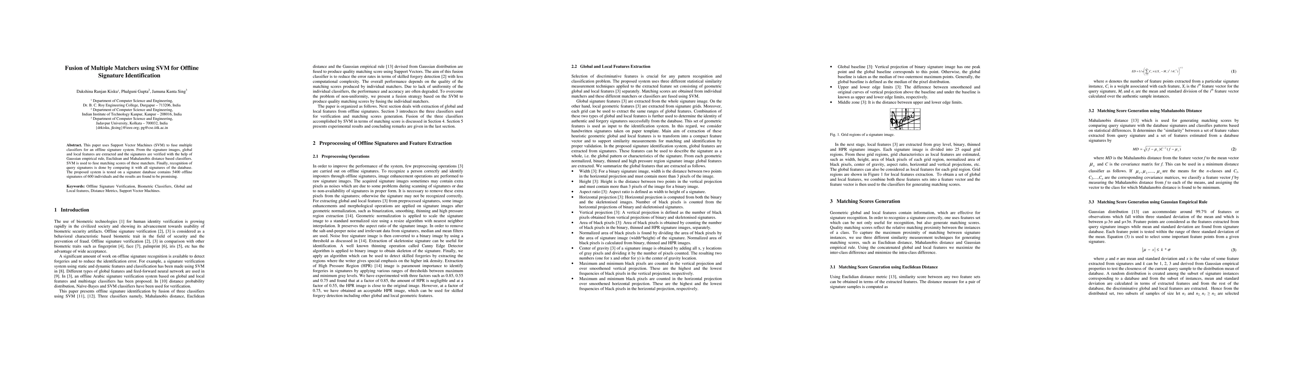 This paper uses Support Vector Machines (SVM) to fuse multiple classifiers for an offline signature system. From the signature images, global and local features are extracted and the signatures are verified with the help of Gaussian empirical rule, Euclidean and Mahalanobis distance based classifiers. SVM is used to fuse matching scores of these matchers. Finally, recognition of query signatures is done by comparing it with all signatures of the database. The proposed system is tested on a signature database contains 5400 offline signatures of 600 individuals and the results are found to be promising.