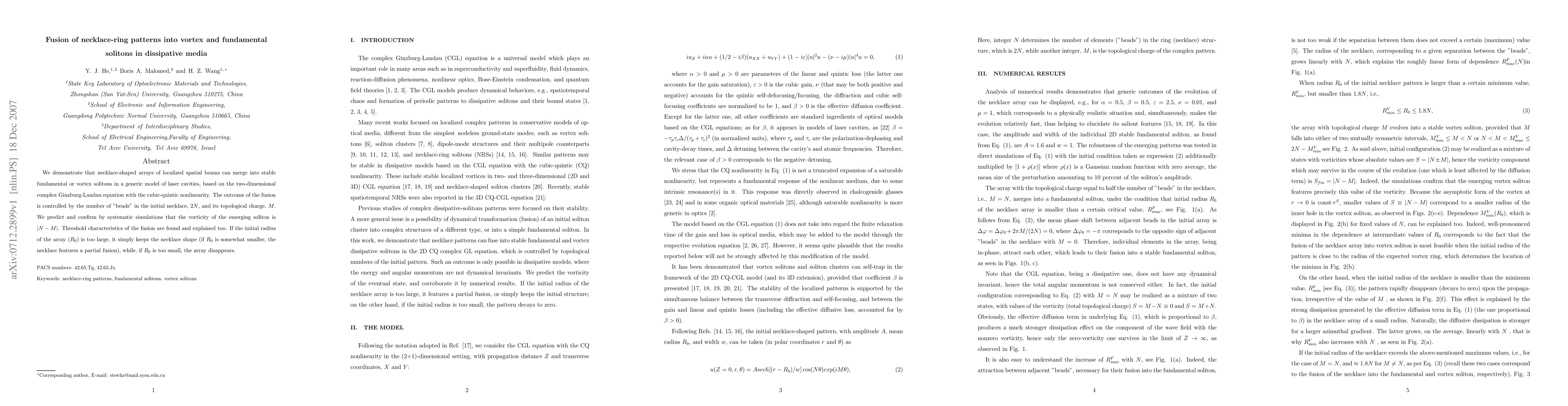 We demonstrate that necklace-shaped arrays of localized spatial beams can merge into stable fundamental or vortex solitons in a generic model of laser cavities, based on the two-dimensional complex Ginzburg-Landau equation with the cubic-quintic nonlinearity. The outcome of the fusion is controlled by the number of beads in the initial necklace, 2N, and its topological charge, M. We predict and confirm by systematic simulations that the vorticity of the emerging soliton is the absolute value of difference of N and M. Threshold characteristics of the fusion are found and explained too. If the initial radius of the array (R0) is too large, it simply keeps the necklace shape (if R0 is somewhat smaller, the necklace features a partial fusion), while, if R0 is too small, the array disappears.