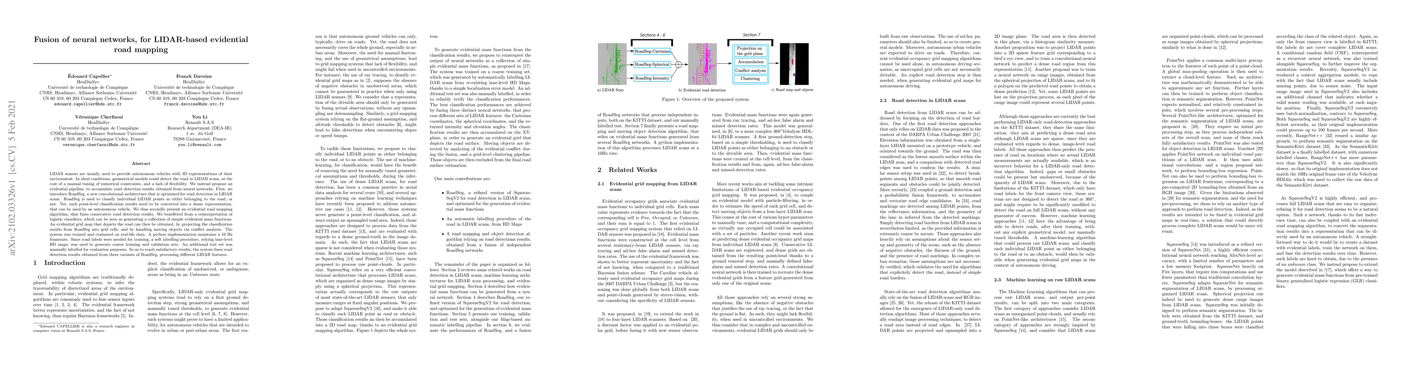 This paper proposes an evidential pipeline for LIDAR-based road mapping using neural networks, introducing RoadSeg for road detection in LIDAR scans and an evidential road mapping algorithm to fuse detection results into a dense representation for autonomous vehicles. The system maintains a 10 Hz framerate and uses soft labelling from HD maps for training.