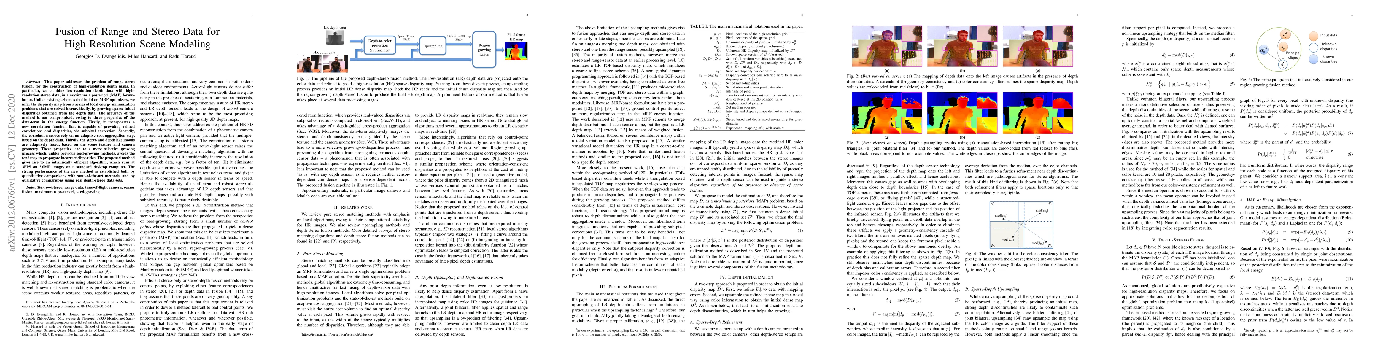 This paper proposes a fusion method for high-resolution scene-modeling by combining low-resolution depth data with high-resolution stereo data in a maximum a posteriori (MAP) formulation. The disparity map is inferred hierarchically from sparse initial disparities obtained from depth data, using local energy minimization problems. The method incorporates a refined correlation function for subpixel correction, adaptive cost aggregation based on depth data, and adaptive fusion of stereo and depth likelihoods based on scene texture and camera geometry.