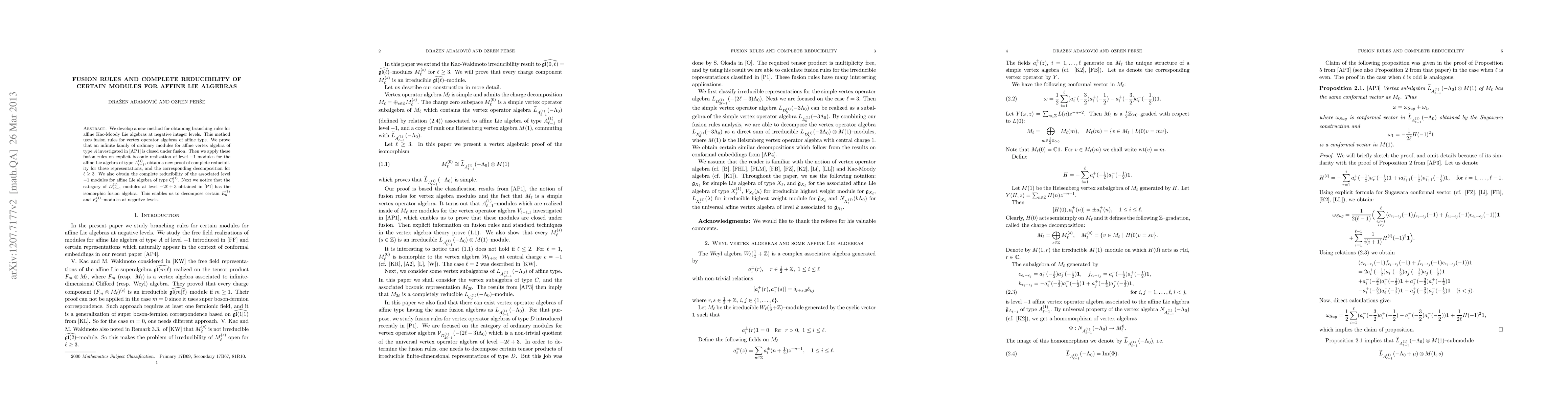 We develop a new method for obtaining branching rules for affine Kac-Moody Lie algebras at negative integer levels. This method uses fusion rules for vertex operator algebras of affine type. We prove that an infinite family of ordinary modules for affine vertex algebra of type A investigated in Adamovi\'c and O. Per\v{s}e (2008) is closed under fusion. Then we apply these fusion rules on explicit bosonic realization of level -1 modules for the affine Lie algebra of type $A_{\ell-1}^{(1)}$, obtain a new proof of complete reducibility for these representations, and the corresponding decomposition for $\ell \ge 3$. We also obtain the complete reducibility of the associated level -1 modules for affine Lie algebra of type $C_{\ell}^{(1)}$. Next we notice that the category of $D_{2 \ell -1}^{(1)}$ modules at level $- 2 \ell +3 $ obtained in Per\v{s}e (2012) has the isomorphic fusion algebra. This enables us to decompose certain $E_6 ^{(1)}$ and $F_4 ^{(1)}$--modules at negative levels.