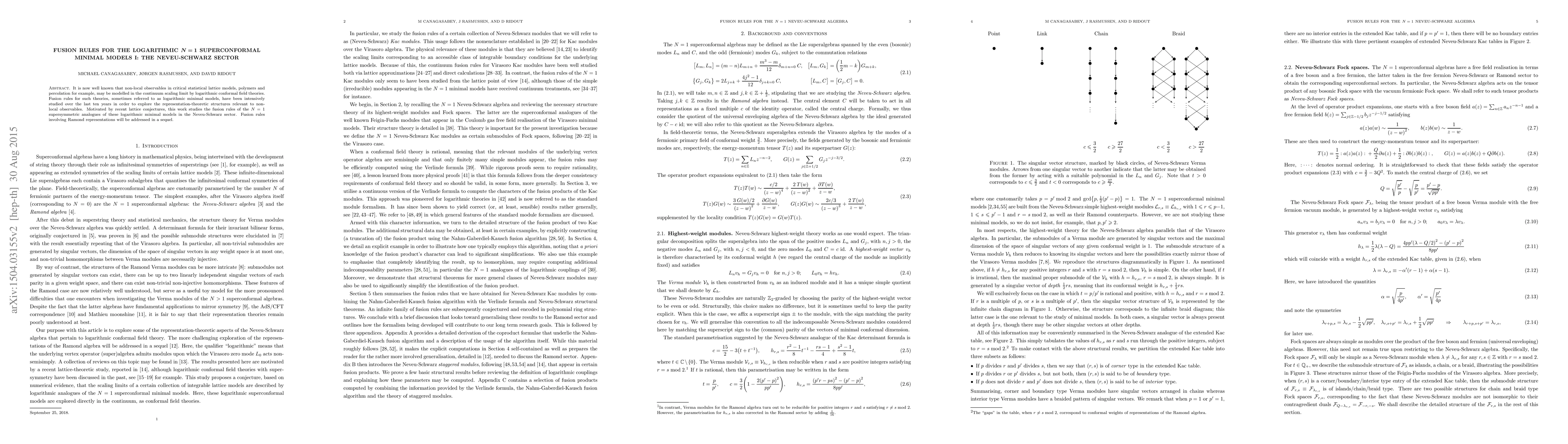 It is now well known that non-local observables in critical statistical lattice models, polymers and percolation for example, may be modelled in the continuum scaling limit by logarithmic conformal field theories. Fusion rules for such theories, sometimes referred to as logarithmic minimal models, have been intensively studied over the last ten years in order to explore the representation-theoretic structures relevant to non-local observables. Motivated by recent lattice conjectures, this work studies the fusion rules of the $N=1$ supersymmetric analogues of these logarithmic minimal models in the Neveu-Schwarz sector. Fusion rules involving Ramond representations will be addressed in a sequel.