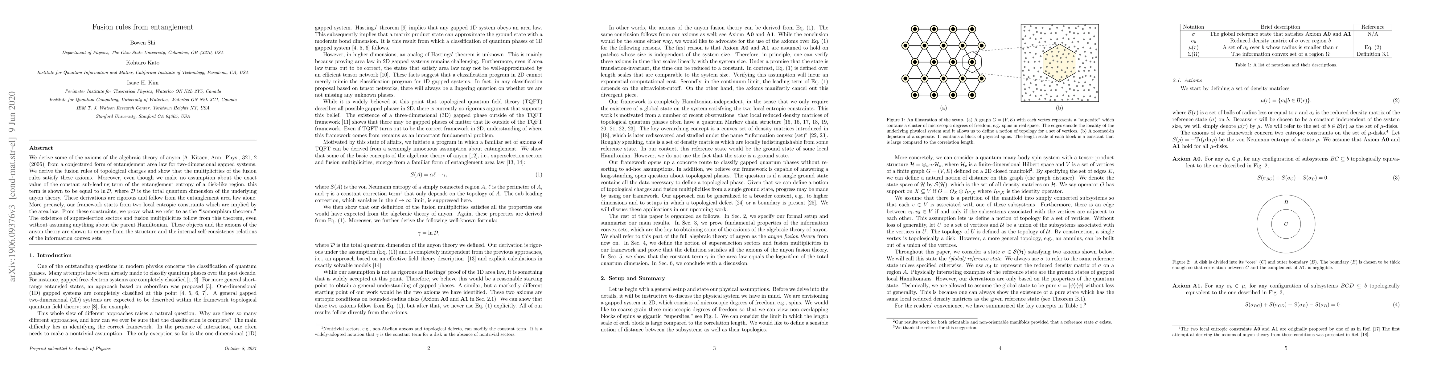 We derive some of the axioms of the algebraic theory of anyon [A. Kitaev, Ann. Phys., 321, 2 (2006)] from a conjectured form of entanglement area law for two-dimensional gapped systems. We derive the fusion rules of topological charges and show that the multiplicities of the fusion rules satisfy these axioms. Moreover, even though we make no assumption about the exact value of the constant sub-leading term of the entanglement entropy of a disk-like region, this term is shown to be equal to $\ln \mathcal{D}$, where $\mathcal{D}$ is the total quantum dimension of the underlying anyon theory. These derivations are rigorous and follow from the entanglement area law alone. More precisely, our framework starts from two local entropic constraints, which are implied by the area law. From these constraints, we prove what we refer to as the "isomorphism theorem." The existence of superselection sectors and fusion multiplicities follows from this theorem, even without assuming anything about the parent Hamiltonian. These objects and the axioms of the anyon theory are shown to emerge from the structure and the internal self-consistency relations of the information convex sets.