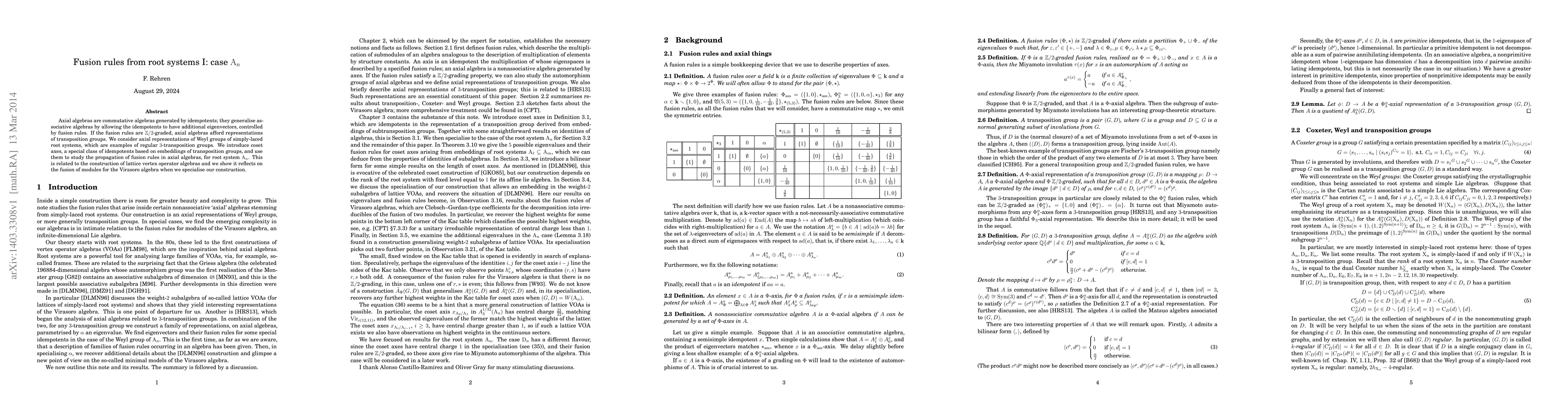 Axial algebras are commutative algebras generated by idempotents; they generalise associative algebras by allowing the idempotents to have additional eigenvectors, controlled by fusion rules. If the fusion rules are $\mathbb{Z}/2$-graded, axial algebras afford representations of transposition groups. We consider axial representations of Weyl groups of simply-laced root systems, which are examples of regular $3$-transposition groups. We introduce coset axes, a special class of idempotents based on embeddings of transposition groups, and use them to study the propagation of fusion rules in axial algebras, for root system ${\rm A}_n$. This is related to the construction of lattice vertex operator algebras and we show it reflects on the fusion of modules for the Virasoro algebra when we specialise our construction.