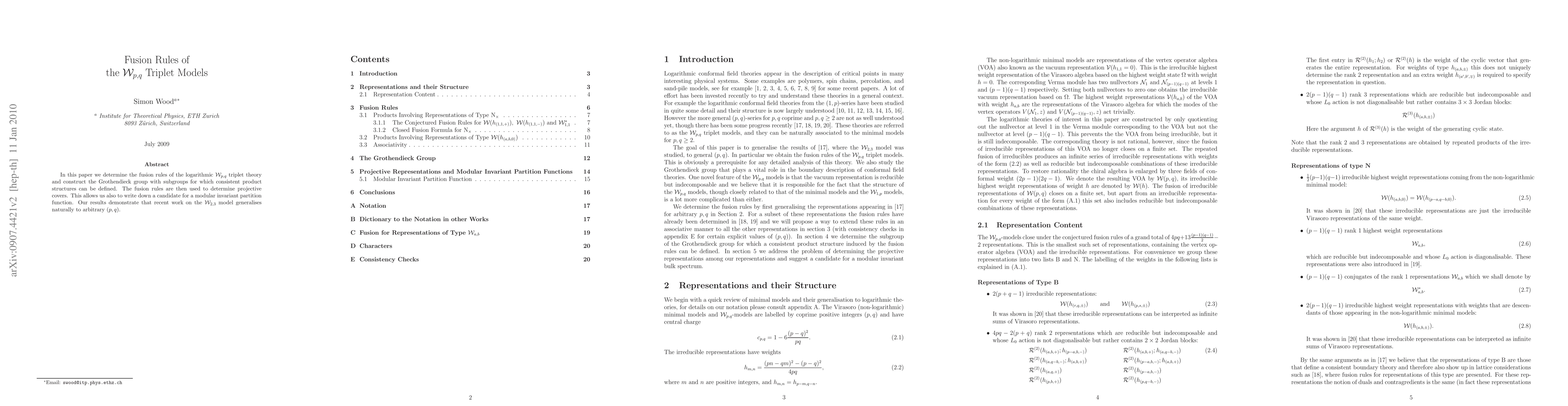 This paper determines the fusion rules for the logarithmic ${\cal W}_{p,q}$ triplet models and constructs the Grothendieck group for consistent product structures, leading to the identification of projective covers and a candidate modular invariant partition function. The findings generalize recent results for the ${\cal W}_{2,3}$ model to all (p,q) pairs.