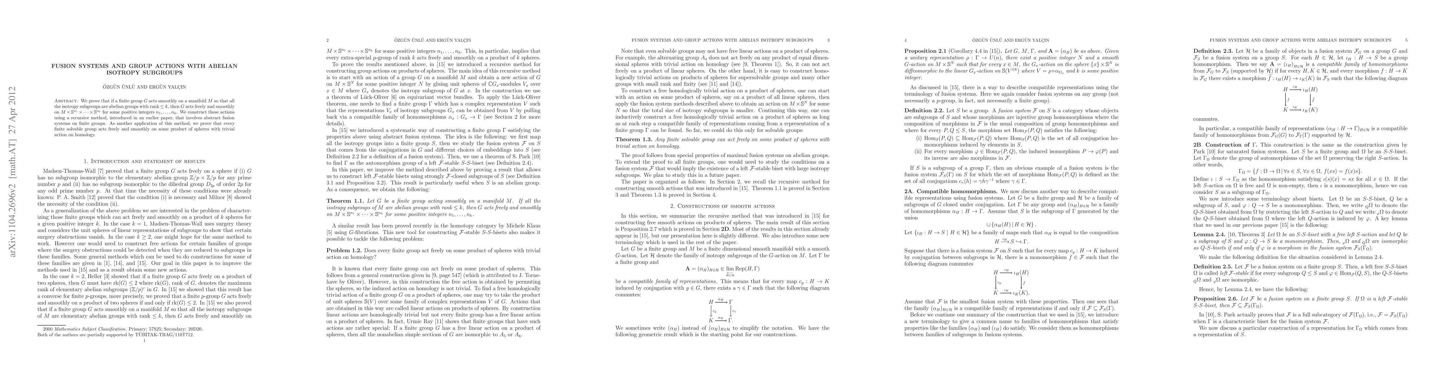 We prove that if a finite group $G$ acts smoothly on a manifold $M$ so that all the isotropy subgroups are abelian groups with rank $\leq k$, then $G$ acts freely and smoothly on $M \times \bbS^{n_1} \times...\times \bbS^{n_k}$ for some positive integers $n_1,...n_k$. We construct these actions using a recursive method, introduced in an earlier paper, that involves abstract fusion systems on finite groups. As another application of this method, we prove that every finite solvable group acts freely and smoothly on some product of spheres with trivial action on homology.