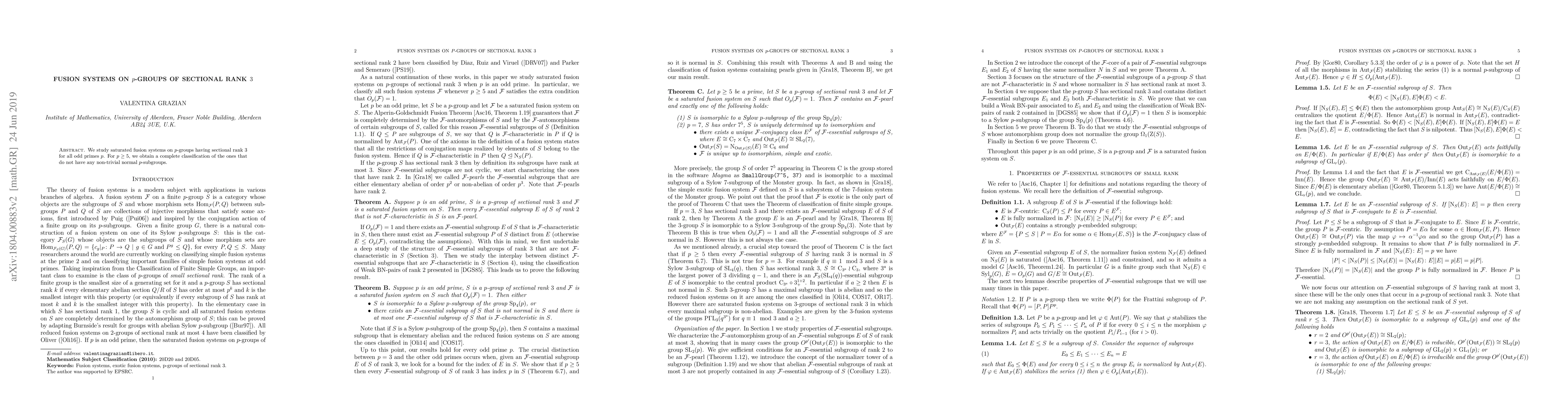 Summary: This paper classifies saturated fusion systems on $p$-groups with sectional rank 3 for odd primes $p \geq 5$, focusing on those without non-trivial normal $p$-subgroups, providing a complete characterization.