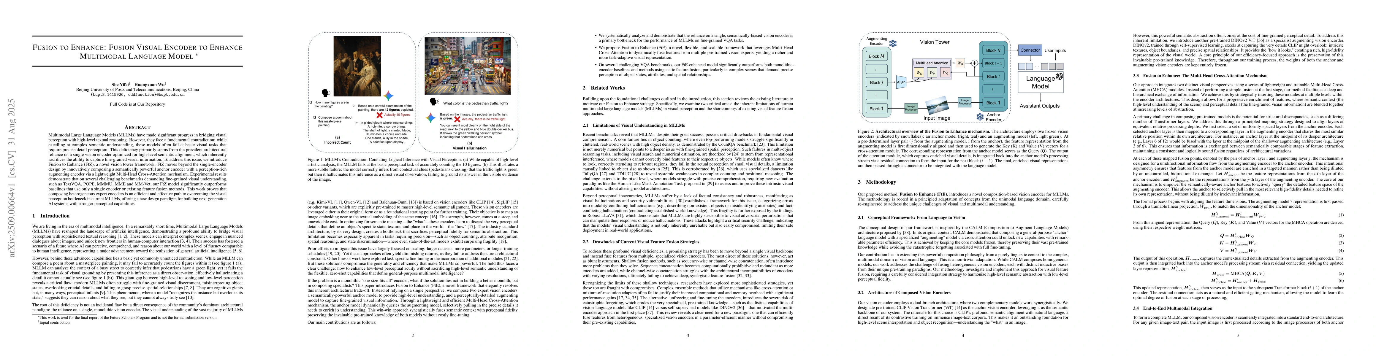 Multimodal Large Language Models (MLLMs) have made significant progress in bridging visual perception with high-level textual reasoning. However, they face a fundamental contradiction: while excelling at complex semantic understanding, these models often fail at basic visual tasks that require precise detail perception. This deficiency primarily stems from the prevalent architectural reliance on a single vision encoder optimized for high-level semantic alignment, which inherently sacrifices the ability to capture fine-grained visual information. To address this issue, we introduce Fusion to Enhance (FtZ), a novel vision tower framework. FtZ moves beyond the single-encoder design by innovatively composing a semantically powerful anchor encoder with a perception-rich augmenting encoder via a lightweight Multi-Head Cross-Attention mechanism. Experimental results demonstrate that on several challenging benchmarks demanding fine-grained visual understanding, such as TextVQA, POPE, MMMU, MME and MM-Vet, our FtZ model significantly outperforms baselines that use only a single encoder or existing feature fusion methods. This work proves that composing heterogeneous expert encoders is an efficient and effective path to overcoming the visual perception bottleneck in current MLLMs, offering a new design paradigm for building next-generation AI systems with stronger perceptual capabilities.