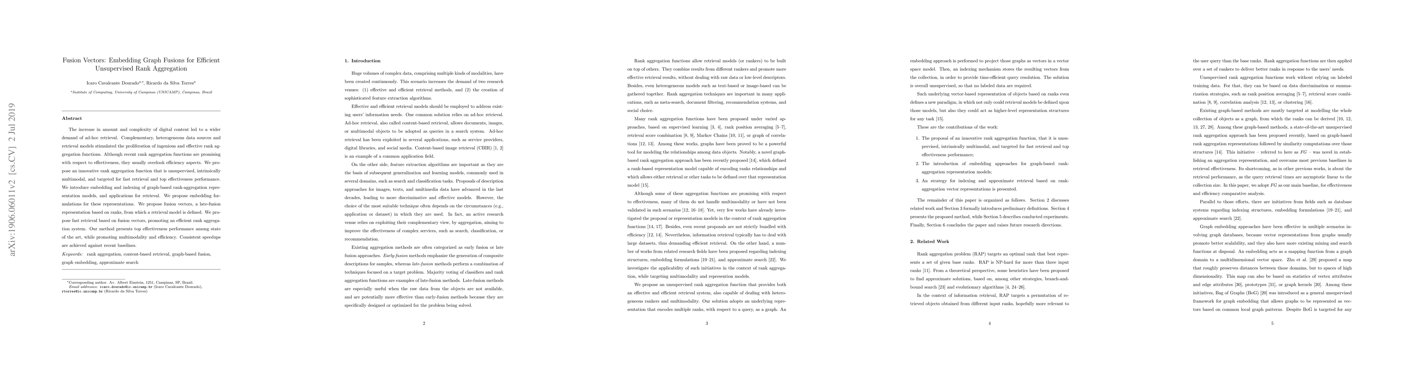 The paper proposes a novel unsupervised rank aggregation function called fusion vectors, which efficiently combines graph-based rank representations for fast retrieval. The method achieves top effectiveness performance and consistent speedups compared to recent baselines, addressing both multimodality and efficiency in rank aggregation.