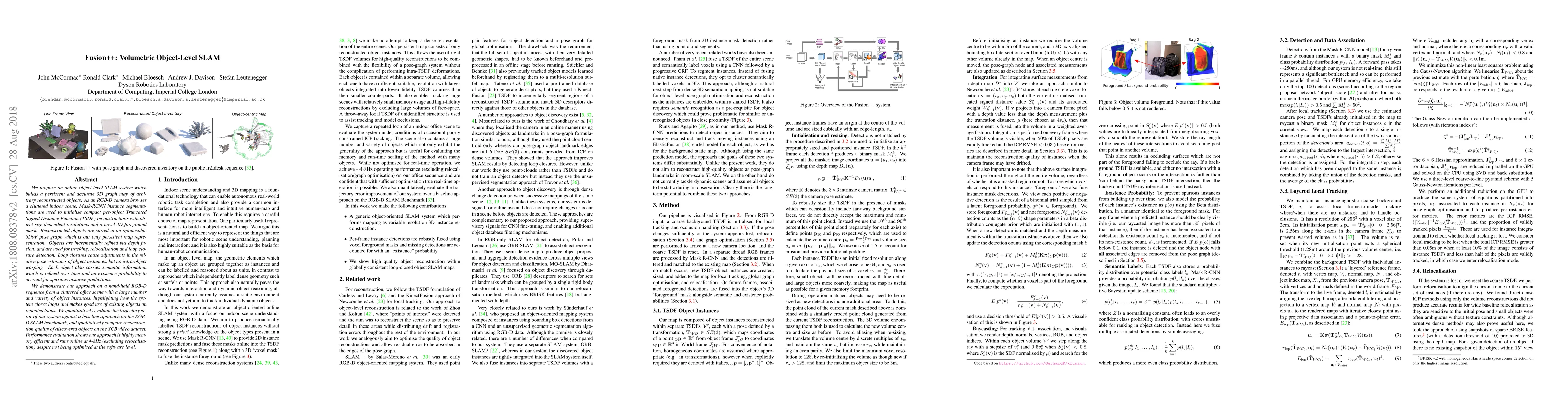 Fusion++ proposes an online object-level SLAM system that constructs a persistent 3D graph map of reconstructed objects using Mask-RCNN and TSDF reconstructions. The system demonstrates high memory efficiency and real-time performance, achieving accurate loop closure and object tracking in cluttered indoor environments.
