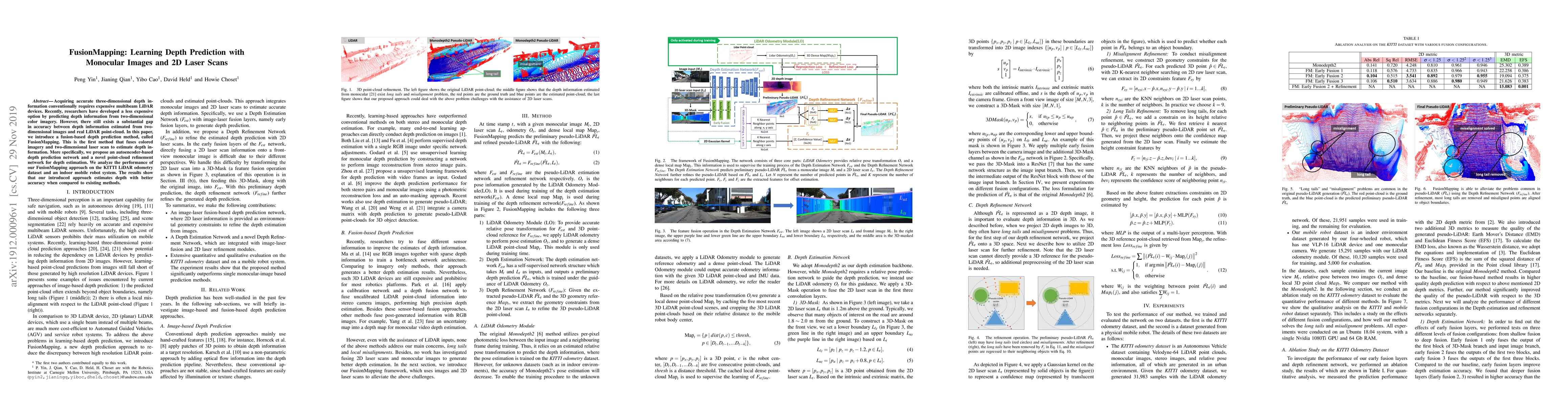 Acquiring accurate three-dimensional depth information conventionally requires expensive multibeam LiDAR devices. Recently, researchers have developed a less expensive option by predicting depth information from two-dimensional color imagery. However, there still exists a substantial gap in accuracy between depth information estimated from two-dimensional images and real LiDAR point-cloud. In this paper, we introduce a fusion-based depth prediction method, called FusionMapping. This is the first method that fuses colored imagery and two-dimensional laser scan to estimate depth in-formation. More specifically, we propose an autoencoder-based depth prediction network and a novel point-cloud refinement network for depth estimation. We analyze the performance of our FusionMapping approach on the KITTI LiDAR odometry dataset and an indoor mobile robot system. The results show that our introduced approach estimates depth with better accuracy when compared to existing methods.