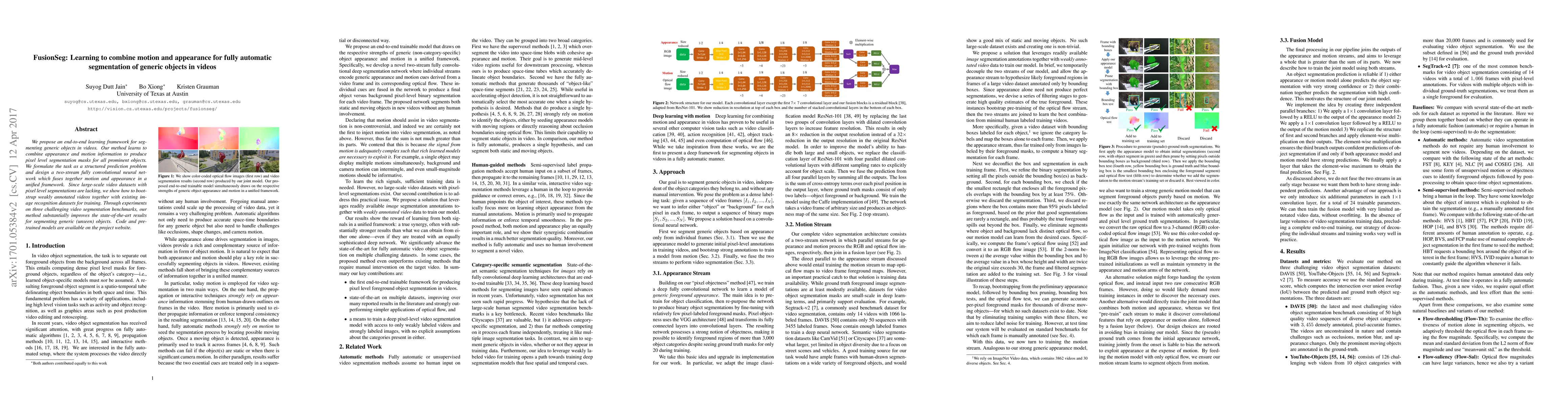 We propose an end-to-end learning framework for segmenting generic objects in videos. Our method learns to combine appearance and motion information to produce pixel level segmentation masks for all prominent objects in videos. We formulate this task as a structured prediction problem and design a two-stream fully convolutional neural network which fuses together motion and appearance in a unified framework. Since large-scale video datasets with pixel level segmentations are problematic, we show how to bootstrap weakly annotated videos together with existing image recognition datasets for training. Through experiments on three challenging video segmentation benchmarks, our method substantially improves the state-of-the-art for segmenting generic (unseen) objects. Code and pre-trained models are available on the project website.