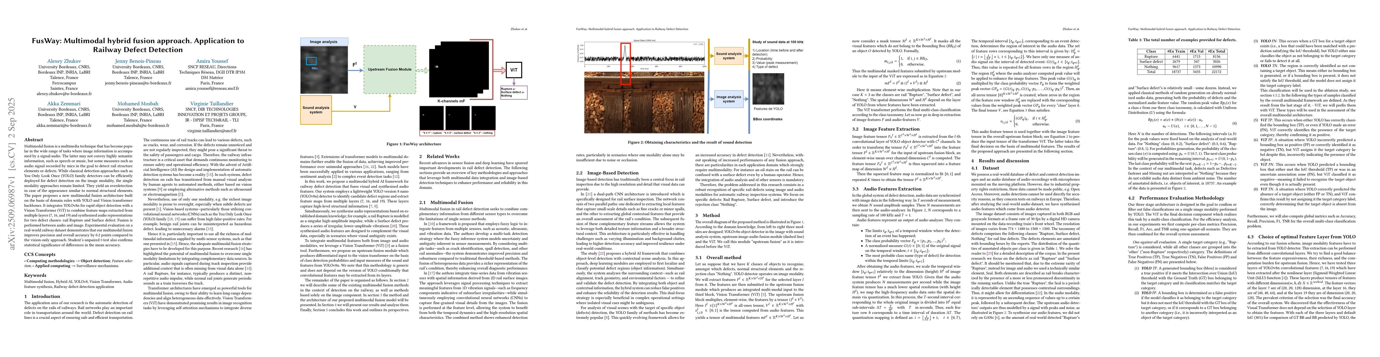 Multimodal fusion is a multimedia technique that has become popular in the wide range of tasks where image information is accompanied by a signal/audio. The latter may not convey highly semantic information, such as speech or music, but some measures such as audio signal recorded by mics in the goal to detect rail structure elements or defects. While classical detection approaches such as You Only Look Once (YOLO) family detectors can be efficiently deployed for defect detection on the image modality, the single modality approaches remain limited. They yield an overdetection in case of the appearance similar to normal structural elements. The paper proposes a new multimodal fusion architecture built on the basis of domain rules with YOLO and Vision transformer backbones. It integrates YOLOv8n for rapid object detection with a Vision Transformer (ViT) to combine feature maps extracted from multiple layers (7, 16, and 19) and synthesised audio representations for two defect classes: rail Rupture and Surface defect. Fusion is performed between audio and image. Experimental evaluation on a real-world railway dataset demonstrates that our multimodal fusion improves precision and overall accuracy by 0.2 points compared to the vision-only approach. Student's unpaired t-test also confirms statistical significance of differences in the mean accuracy.