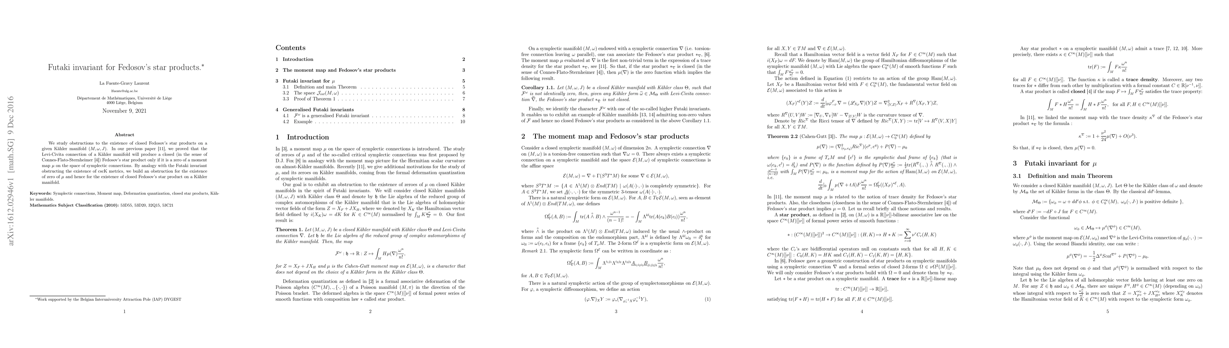 We study obstructions to the existence of closed Fedosov's star products on a given K\"ahler manifold. In our previous paper, we proved that the Levi-Civita connection of a K\"ahler manifold will produce a closed (in the sense of Connes-Flato-Sternheimer) Fedosov's star product only if it is a zero of the Cahen-Gutt moment map on the space of symplectic connections. By analogy with the Futaki invariant obstructing the existence of cscK metrics, we build an obstruction for the existence of zero of the moment map and hence for the existence of closed Fedosov's star products on a K\"ahler manifold.