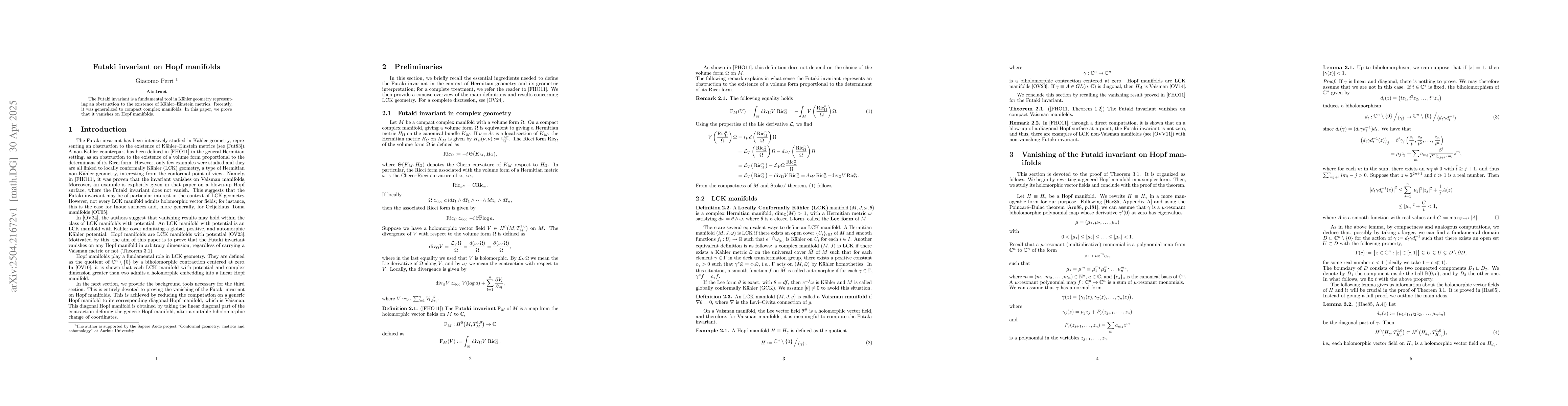 The paper presents a proof that the Futaki invariant vanishes on Hopf manifolds, extending its known properties from Kähler manifolds to compact complex manifolds.