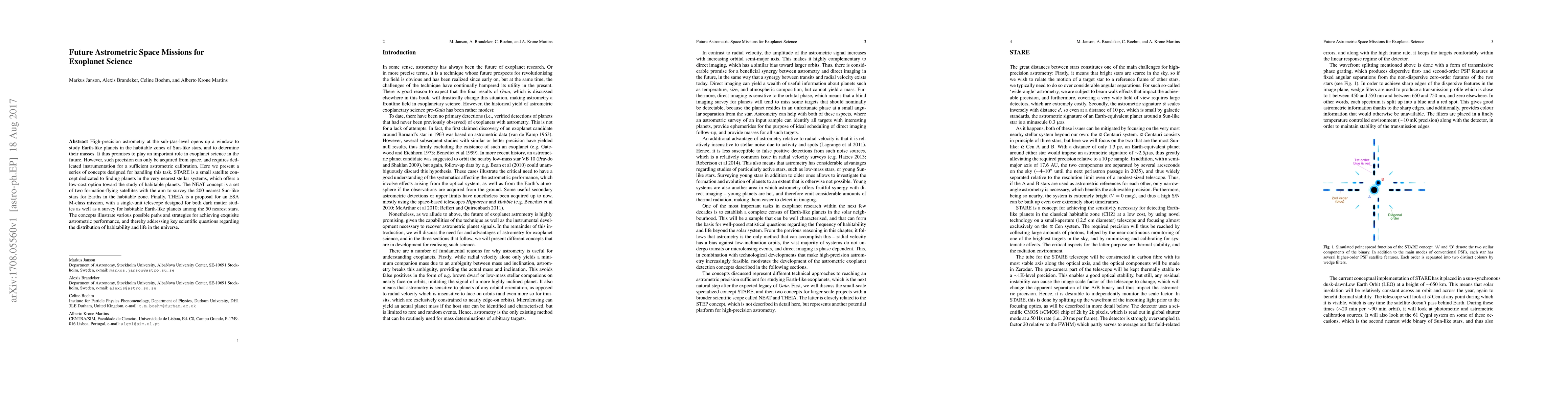 This paper explores future astrometric space missions, including the STARE, NEAT, and THEIA concepts, aimed at achieving high-precision astrometry to detect and characterize Earth-like planets in habitable zones. These missions propose innovative strategies for studying habitability and the distribution of life in the universe.