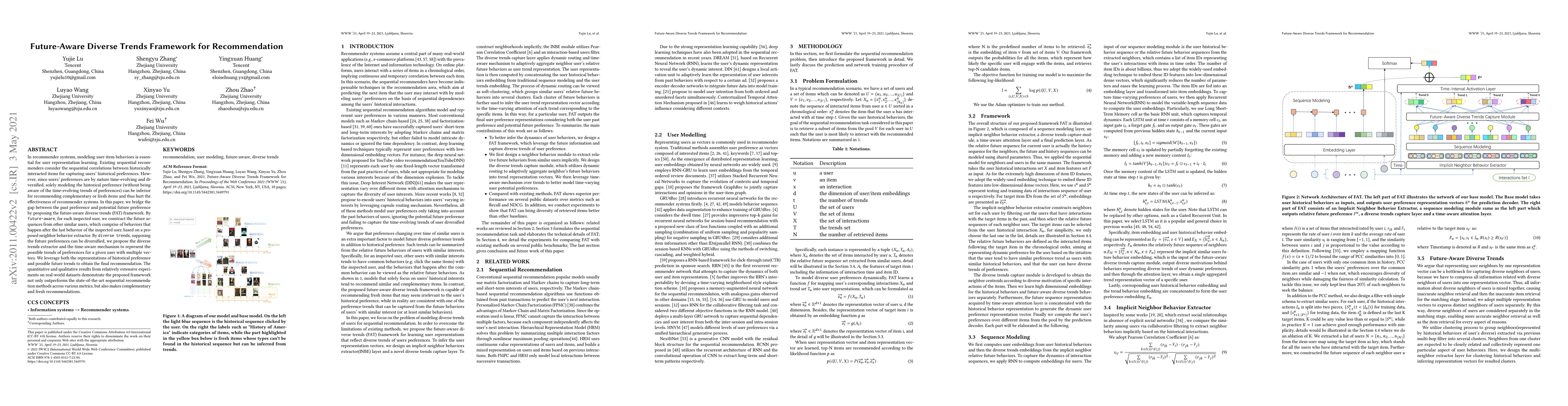 The paper proposes the Future-Aware Diverse Trends (FAT) framework to enhance recommender systems by modeling both historical user preferences and potential future trends, leading to better complementary and fresh recommendations. The framework constructs future sequences from similar users and uses diverse trend representations to capture evolving preferences.