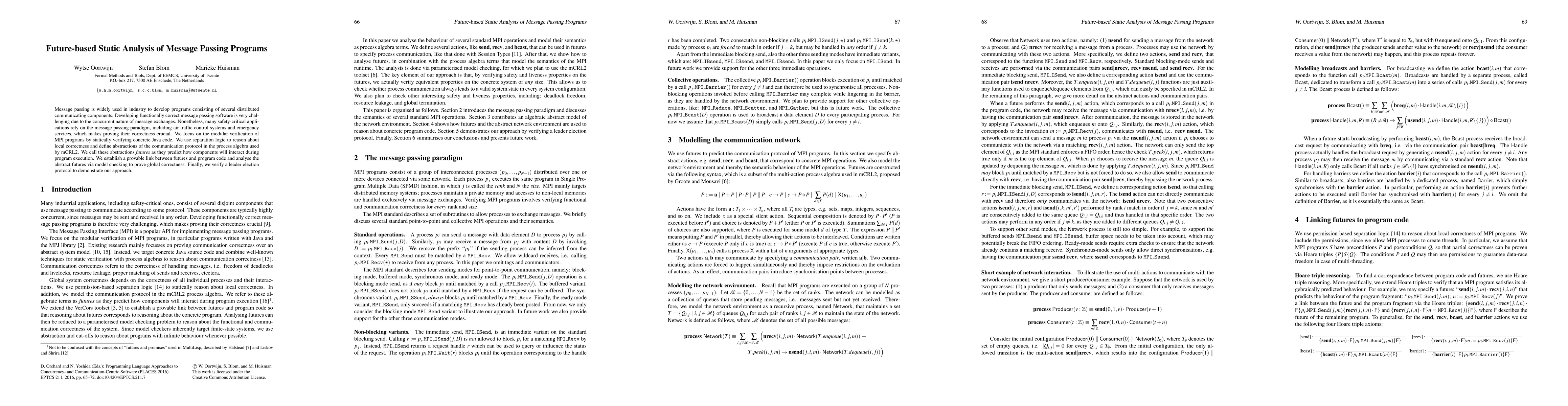 Message passing is widely used in industry to develop programs consisting of several distributed communicating components. Developing functionally correct message passing software is very challenging due to the concurrent nature of message exchanges. Nonetheless, many safety-critical applications rely on the message passing paradigm, including air traffic control systems and emergency services, which makes proving their correctness crucial. We focus on the modular verification of MPI programs by statically verifying concrete Java code. We use separation logic to reason about local correctness and define abstractions of the communication protocol in the process algebra used by mCRL2. We call these abstractions futures as they predict how components will interact during program execution. We establish a provable link between futures and program code and analyse the abstract futures via model checking to prove global correctness. Finally, we verify a leader election protocol to demonstrate our approach.