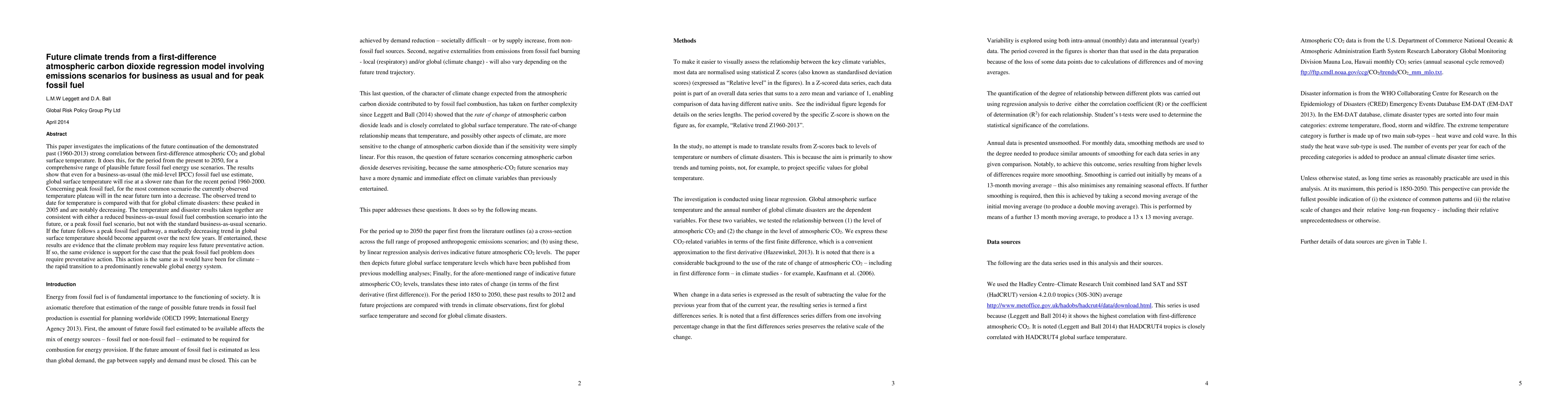 This paper investigates the implications of the future continuation of the demonstrated past (1960-2012) strong correlation between first-difference atmospheric CO2 and global surface temperature. It does this, for the period from the present to 2050, for a comprehensive range of future global fossil fuel energy use scenarios. The results show that even for a business-as-usual (the mid-level IPCC) fossil fuel use estimate, global surface temperature will rise at a slower rate than for the recent period 1960-2000. Concerning peak fossil fuel, for the most common scenario the currently observed (1998-2013)temperature plateau will turn into a decrease. The observed trend to date for temperature is compared with that for global climate disasters: these peaked in 2005 and are notably decreasing. The temperature and disaster results taken together are consistent with either a reduced business-as-usual fossil fuel use scenario into the future, or a peak fossil fuel scenario, but not with the standard business-as-usual scenario. If the future follows a peak fossil fuel pathway, a markedly decreasing trend in global surface temperature should become apparent over the next few years. If entertained, these results are evidence that the climate problem may require less preventative action. If so, the same evidence is support for the case that the peak fossil fuel problem does require preventative action. This action is the same as it would have been for climate - the rapid transition to a predominantly renewable global energy system.