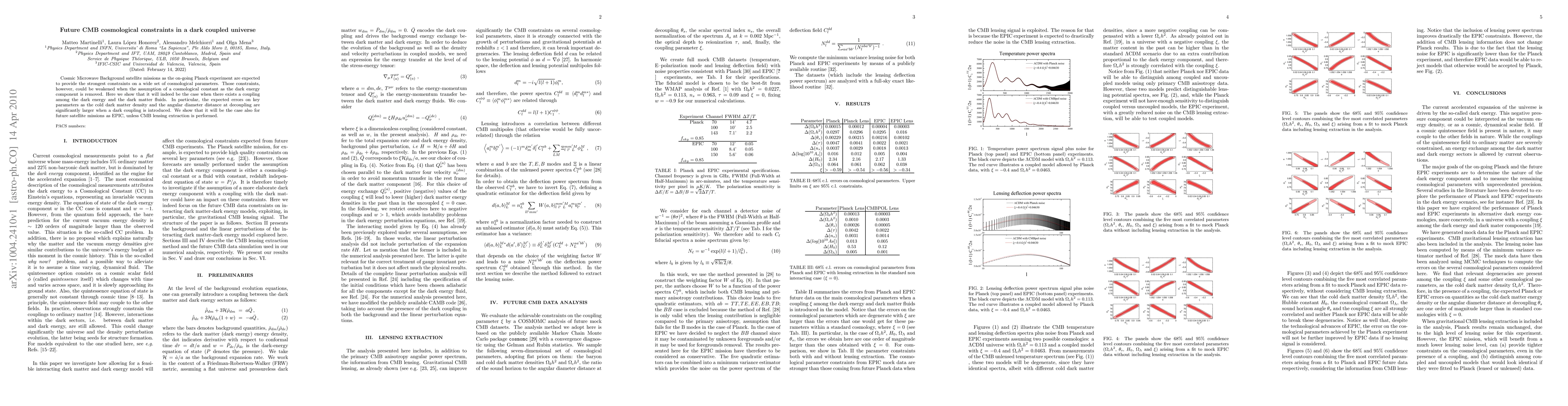 Cosmic Microwave Background satellite missions as the on-going Planck experiment are expected to provide the strongest constraints on a wide set of cosmological parameters. Those constraints, however, could be weakened when the assumption of a cosmological constant as the dark energy component is removed. Here we show that it will indeed be the case when there exists a coupling among the dark energy and the dark matter fluids. In particular, the expected errors on key parameters as the cold dark matter density and the angular diameter distance at decoupling are significantly larger when a dark coupling is introduced. We show that it will be the case also for future satellite missions as EPIC, unless CMB lensing extraction is performed.