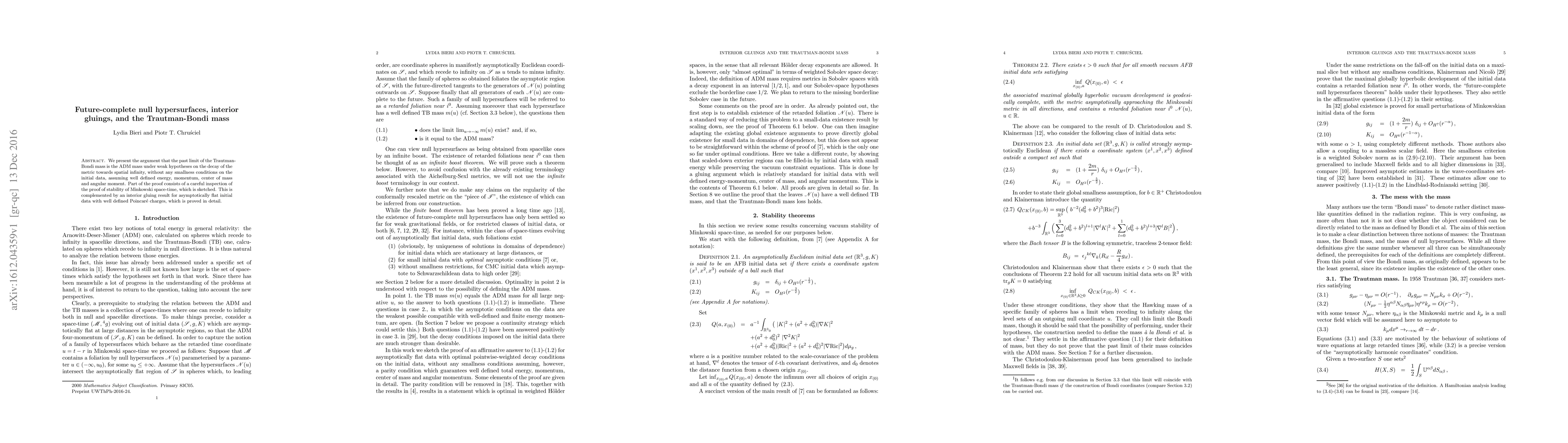 We present the argument that the past limit of the Trautman-Bondi mass is the ADM mass under weak hypotheses on the decay of the metric towards spatial infinity, without any smallness conditions on the initial data, assuming well defined energy, momentum, center of mass and angular moment. Part of the proof consists of a careful inspection of the proof of stability of Minkowski space-time, which is sketched. This is complemented by an interior gluing result for asymptotically flat initial data with well defined Poincar\'e charges, which is proved in detail.
