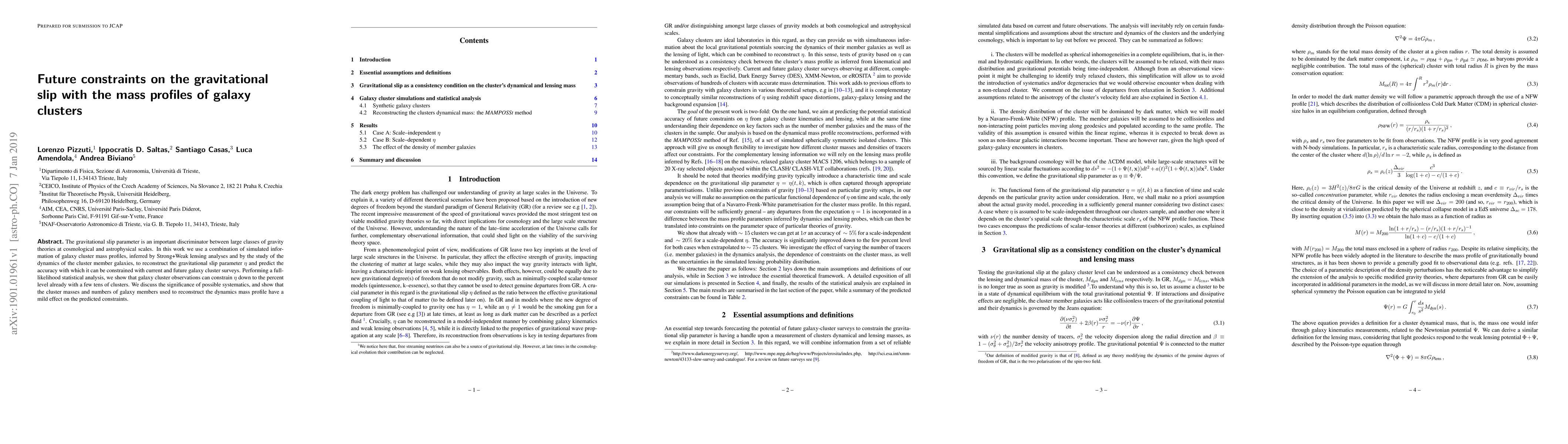 This paper investigates the gravitational slip parameter $\eta$ using galaxy cluster mass profiles derived from lensing and dynamics, predicting that future surveys can constrain $\eta$ to the percent level with a few tens of clusters. The study highlights the minimal impact of systematics and cluster mass variations on these constraints.
